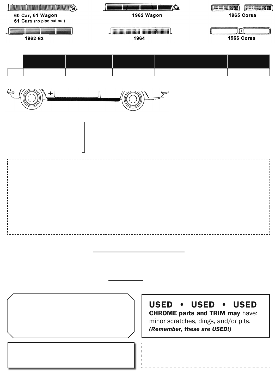 iWARNING: Products on this page can expose you to a chemical, which is known to the St ate of California to cause cancer or reproductive harm. **For more information go to www.P65Warnings.ca.gov**384USED REAR ALUMINUM AIR GRILLS & TRIMThese aluminum grills and trim are quite rare. We will never have a show quality USED one. Available as GOOD but we usually do not have any.GOOD = Minor scratches and/or minor dings, and/or corrosion, grease and oil. Acceptable for everyday car.1960 Cars & 61 Wagons (has pipe cut out)4 lbs.1961 Cars (exc. Wagon)Like 60 but has no pipe cut out - 4 lbs.1962-63 Cars (exc. 62 Wagon)4 lbs.1962 Wagon 4 lbs.1965 Corsa"Wire Mesh" - 2 needed 12 oz.1966 CorsaGoes "around" louvered section - 2 lbs.GOODCU2949 CU2951 CU2953 CU2955 CU2959 CU2961USED ROCKER PANEL TRIM - no hardwareWe'd rate these as "good USED". Road tar but no major dents. Will have scuffs, scratches, slight corrosion and minor dents. These are USED! Acceptable for everyday car.1960-62 "500/700" L or R CU32651962 Monza - Left CU3266 Monza - Right CU32671963 Monza - Left CU3268 Monza - Right CU32691963 "700" L or R CU3270All Rocker Panels are 10 lbs. each + AH. See page 370 for AH infoUSED DOOR SILL TRIM EXTENSIONSWill have scuffs, scratches, slight corrosion and minor dents. These are USED! Acceptable for everyday car. 1960-64 COUPE REAR EXTENSION Left CU2946 1 lb. Right CU2947 1 lb. 1965-69 COUPE & CT. REAR EXTENSION Left CU3666 1 lb. Right CU3667 1 lb.Please don't wait to buy new reprosSome customers think that once we have a new repro in stock that they can wait years to purchase, but consider the following arguments for buying sooner rather than later: 1. Sometimes, we sell out, lose the supplier, or can't warrant the large re-run requirements. 2. The sooner we see your orders, the sooner we can start reproducing other parts.THANKS TO ALL OF OUR CUSTOMERS FOR YOUR CONTINUED SUPPORT.It makes it possible for Clark's to do the repros you need.JOIN CORSA!A STRONG Corvair club is important in ways you may not realize. Enjoy Camaraderie, Tech Support, Share "Stories", Picnics, Parties, Shows, Club Events & more. CORSA (Corvair club) info & application - C2 FREETo Find a Local Corvair Club & Expand Your Horizons:Go to www.corvair.org (CORSA web site)Click: Corsa Online, Corsa Chapters, Enter your State, click ?lterAll parts on pages 343-384are USEDYou Must be SatisfiedWe double check all Used Parts but you are the final judge. If you are not happy with a Used Part please call and talk to a "Tech" person. DIRTY? . . . yes Many of these parts may still be greasy or dirty.Please read the used Parts Intro Page..USED o USED o USEDCHROME parts and TRIM may have:minor scratches, dings, and/or pits.(Remember, these are USED!)k