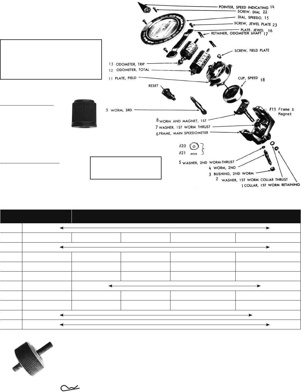 iWARNING: Products on this page can expose you to a chemical, which is known to the St ate of California to cause cancer or reproductive harm. **For more information go to www.P65Warnings.ca.gov**136Exploded View of Typical Corvair SpeedometerThese parts are becoming discontinuedIn order to install a new magnet or if you get a new frame with magnet - the speedometer will NOT work until "CALIBRATED" (MAGNE-TIZED). Replace 2nd worn (#4) before it goes bad and wears the magnet gear.NOTE:#4 is the usual reason why the odometer stops.Rubber Knob - Trip Reset: Spyder & Corsa - knob pushes on. C19 1 oz.Rebuilt Speedos - See page 210SPEEDOMETER APPLICATIONNo guarantee on how long stock will last!- - - - (dash) means no part available.MORE DASH PARTS - See page 210ALL ITEMS 2 oz. ea. (unless otherwise noted)SPEEDO CABLES Page 132Picture # 1960-64 (exc. Turbo) 1962-64 TURBO 1965-66 CORSA 1965-69 (exc. Speed Control) 1967-68 with Speed Control2 C2893 All4 C2895 C2907 C2919 C2928 C29287 C2897 All8 - - - - - - - - - - - - C2909 C2909 - - - - - - - - - - - - C29349 C2898 Discontinued C2898 Discontinued C2921 C2930 C293016 - - - - - - - - - - - - - - - - - - - - - - - - - - - - - - - - - - - - - - - - - - - - - - - - C293517 C2903 C2914 All20 - - - - - - - - - - - - C 2917 C2917 - - - - - - - - - - - - C293821 - - - - - - - - - - - - C2918 C2918 - - - - - - - - - - - - C293922 C2905 - - - - - - - - - - - -23 C2906 All THERMOSTATS (BELLOWS)1961-69 Thermostats. Also see page 106.When your rear air outlet doors stay open and the thermostats are expanded all the time your thermostats (bellows) are bad. These are EXCELLENT REPROS. 2 needed 1961-69 C50RM 6 oz. 1 needed 1960 only "NOS" CX837 8 oz. CLIP: Holds thermostat rod to thermostat. 1960 only. See page 106. C9851 1 oz.BUSHINGS - Thermostat "door": #6 page 106