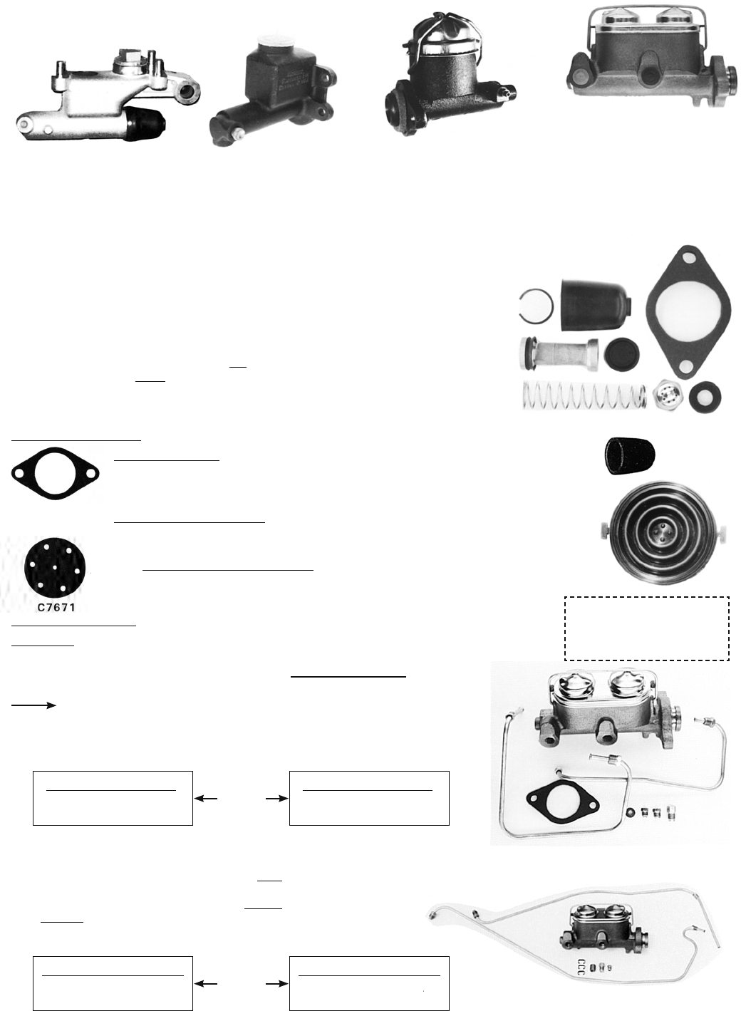 iWARNING: Products on this page can expose you to a chemical, which is known to the St ate of California to cause cancer or reproductive harm. **For more information go to www.P65Warnings.ca.gov**1960-61 CarsC2411 7 lbs.1961-62 Vans (FC)C2412 7 lbs.Late '62 FC may have '63 style1962-66 Cars & 1963-65 Vans (FC) (1" i.d.) C1195R 7 lbs.1962-63 with Factory Metallic (7/8" i.d.) C2374 7 lbs.1967-69 Cars?C1196R 8 lbs.? DOES NOT come with check valves. Manufacturers say they have made the outlets smaller & valves not necessary.Easy Installation!62-66 Cars - Lines includedFC Dual Master Cylinder KitLines included145New Master CylindersC1195R & C1196R will vary slightly from original in appearance. All come with boot, order gasket C1199P separately.Rebuild Kits: Master CylindersNote: None of these kits come with the cover gasket. C656 comes with master cylinder to body seal - other Kits DO NOT. (SEE BELOW) 1960-66 Cars & 1961-65 Vans (FC) (1" bore) C656 10 oz. 1962-63 Cars with Factory Metallic (7/8") C2379 10 oz. ?1967-69 CARS (includes replacement outlet valves) C4695 10 oz. ?1967-69: These valves will only fit original factory master cylinders. They will not fit replacement master cylinders. C4695 comes with all seals and complete primary piston but not the secondary piston.Master Cylinder PartsMaster Cylinder Rubber Boot: 1960-69 input rod goes thru (included in repair kits) C1198 2 oz. Master Cylinder Gasket: 1962-69 Cars - goes between master cylinder and body. Paper (C1199P) is original. Foam style seals better and is in rebuild kit C656 only. Original paper style C1199P 1 oz. Foam replacement style C1199 1 oz. Master Cylinder Top Cover Gasket: Not in rebuild kits. 1960-61 Cars & 61-62 (FC) Vans C1202 2 oz. 1962-66 C1204 2 oz. 1962-63 (See note below) 1967-69 C1205 2 oz. NOTE: 1962-63 Master Cylinder Cover Gasket C7671 4 oz. Does not come in master cylinder kit. This cover gasket was used on master cylinders with the bolt through the center of the cover. Check yours as many cars have been switched to the wire "spring" retainer, and use C1204. Master Cylinder Steel Cover: 1964-66 All C1200 12 oz. 1967-69 (dual brakes) C1201 8 oz.Bleeder Valve: 1962-66 master cylinder replacement bleeder valve C1211 1 oz.Dual Master Cylinder Kits - 62-66 Cars 62-66 Cars Lines Included in All Kits! Can ADD to Clark BRAKE MULTl-KITS Blue page MK-11These CLARK exclusives include a new 67-69 Corvair master cylinder, new pre-bent lines (lines thread right into the master cylinder) and instructions. Does not fit 65-66 with A/C. Includes master cylinder boot (not shown). 1962-64 Cars C10076 9 lbs. 1965-66 Cars (exc. A/C) C10077 9 lbs.f Other parts, see "NOS" on website & USED page 363Replacement 62-64 LINESTO Front C11258 10 oz.TO Rear C11259 10 oz.Replacement 65-66 LINESTO Front C11256 10 oz.TO Rear C11257 10 oz.Included in KitsFC Dual Master Cylinder KitsThese are PREMIUM CLARK KITS with a new Corvair dual master cylinder, PRE-BENT LINES, clips, adaptors and complete instructions. REALLY QUITE EASY! NOTE: If you own a 1963 you must determine if yours has a "hole" where the shifter goes through the gas tank on 63-65 Standards with a floor mounted shifter. If listed as 61-63 there is NO HOLE through gas tank. If listed as 63-65 HAS HOLE through gas tank. Includes master cylinder boot. Dual master cylinder can be ADDED to Brake Multi-Kits Blue page MK-11. 1961-63 FC C11086 9 lbs. 63-65 FC C11087 9 lbs.Replacement 61-63 FC LINESTO Front C11260 1 lb.TO Rear C11261 1 lb.Replacement 63-65 FC LINESTO Front C11296 1 lb.TO Rear C11297 1 lb.Included in KitsBench Bleeding a Master Cylinder?If you bench bleed your master cylinder, do not over-stroke. You only want to push in as much as you would if it was installed in the car. Over-stroking can damage the rubber cups.FC (Van) Floor Plug above Master Cylinder page 149BC656C1198C1204C1199PC1199
