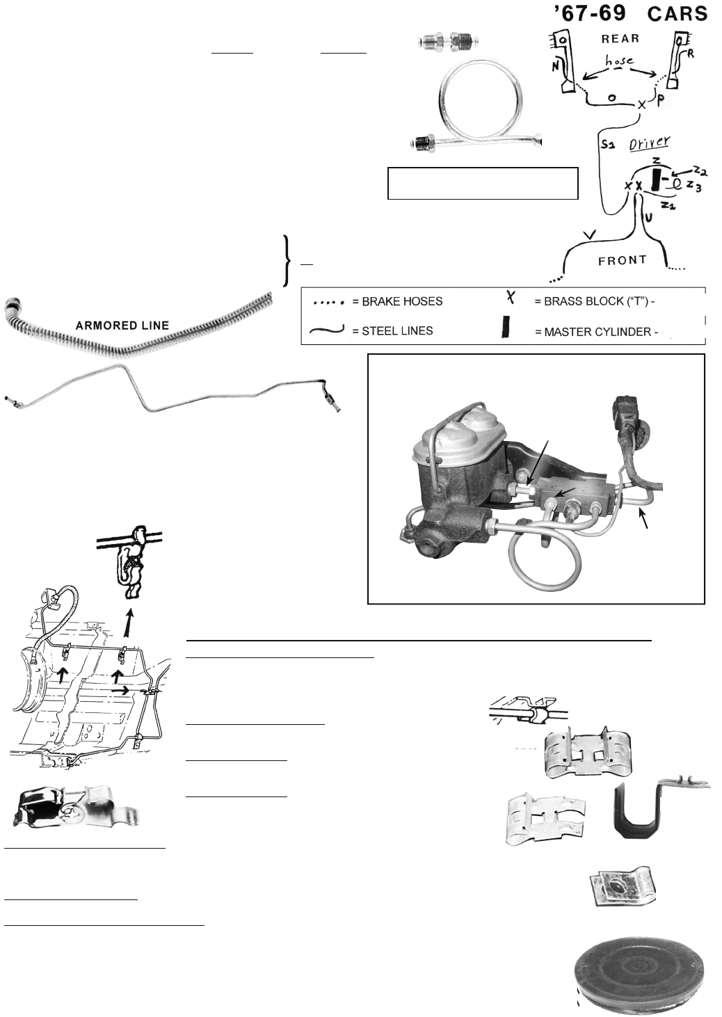 iWARNING: Products on this page can expose you to a chemical, which is known to the St ate of California to cause cancer or reproductive harm. **For more information go to www.P65Warnings.ca.gov**149B1967-69 Cars Individual Lines BRASS "T's" - Page 150 Prevent Leaks - Replace!Brake Line Grommets - Page 150MORE IMPORTANT BRAKE PARTS61-64 Cars Brake/Fuel/Harness Clips: Three used rear of 61-64 cars. Often broken or black vinyl missing. Half is bare and half vinyl - like originals. Order now so you'll have them. Sold each C6897R 2 oz. Set of 3 Screws: Original size C6897T 1 oz.61-64 Cars Brake Line Clips: Above the gas tank, usually rusty, broken or lost. Sold set of 2. C6897C 2 oz.Brake/Gas Line Clip: These clips are used in various locations on various years. C719 2 oz.1960-69 Tunnel Clip: Vinyl covered metal. Holds harnesses & lines for various years. Clips into the floor. Exact repro. C13038 2 oz. FC Front Brake Line Clip (61-65): Not an exact repro, but looks good & works. 2 clips were used on the front cross member & usually one on the frame coming from the master cylinder. C3375 2 oz. ea1969 Front Brake Line Clip: 2 used above gas tank. Sold each. Exact repro. C3378 1 oz.FC Master Cylinder Hole Cover: Covers the hole in the floor above the master cylinder. Stop fighting with that old hardened one; get a new one that pushes right in & seals. 1962 owners - if your hole isn't 2 7/8"-3" and is 3 5/8" then order for a 1963. 61-62: Rubber (no steel insert) C6681A 10 oz. 61-62: Rubber & steel insert C6682A 1 lb. 63: Rubber (no steel insert) 3 5/8" (OK repro) C13368 10 oz. 64-65: Rubber (no steel insert) 4 1/8" (OK repro) C13369 10 oz.Z2Z3 ORIGINAL STAINLESSN Rear Right C3317 8 oz. C13015 Rear Right with "Armor" ('69) C11217 8 oz. C130240 Rear Cross-Over C3319 1 lb. C13016P Short Rear Line C3318 8 oz. C13017 Short Rear Line with "Armor" C11218 8 oz. C13025R Rear Left C3316 8 oz. C13018 Rear Left with "Armor" C11219 8 oz. C13026S1 Long Front to Rear C11220 8 lbs. C13027 Long Front to Rear with "Armor" C11220A 8 lbs. C13028U Front Left C11215 1 lb. C13022 Front Left with "Armor" ('69) C11221 2 lbs. C13030V Front Right C11216 2 lbs. C13023 Front Right with "Armor" C11222 2 lbs. C13032Z Master Cylinder to Rear Block C11223 8 oz. Z1 Master Cylinder to Front Block C11224 8 oz.Z2 Short Master Cylinder Line (Approx. 2") C11225 4 oz.Z3 Master Cylinder with a Loop C11226 8 oz.NO Stainless Available(see NOTE on "ARMOR" at the LINE SETS, page 149, #5)1967-69 Master Cylinder LinesZ3Z1Z2ZPg. 143 Pg. 150Pg. 145C719C13038C3375C3378C6681AC6682AC6897RC6897R