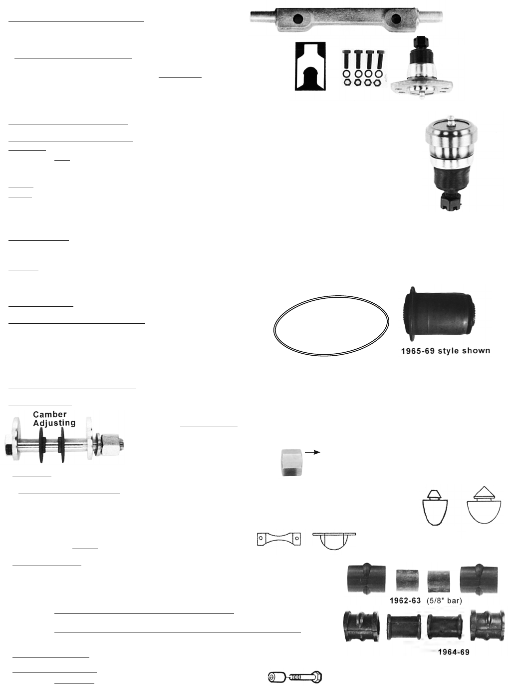 iWARNING: Products on this page can expose you to a chemical, which is known to the St ate of California to cause cancer or reproductive harm. **For more information go to www.P65Warnings.ca.gov**154FRONT SUSPENSION - '60-69 CARSPICTURE # - REFER TO PICTURE DIAGRAM PAGE 153.2. Shafts - Upper Control A-Arm (Forged): Also see page 153 For "Sets" 1960-64 Cars - Either side C6854 2 lbs. 1965-69 Cars - Either side C6855 2 lbs.2 1/2 . 1960-64 Front Suspension Shims: Taking your car in for alignment, these shims are for adjusting camber. Original shape. 2-4 sets suggested. 1/64" C6350 1 oz. 1/32" C6351 1 oz. 1/16" C6352 1 oz. 1/8" C6353 1 oz.3. Upper Control A-Arm: Rebuilt - See page 157A 4. Upper Ball Joints: Not too bad to install. 1960-69 CARS - ALL C44A 1 lb ea. HARDWARE: Upper ball joints come with all hardware but if you need replacements: KITS: SET of 4 Bolts, LW & Nuts C10910 4 oz. SET of 4 Bolts, LW & Nuts, slotted nut, grease fitting & cotter pin. C10911 5 oz.5. Spindle: Often wears where bearing goes - See USED page 362 Gasket: Between front brake backing plate and spindle 1960-64 CARS C1383E 2 oz. ea. 1965-69 CARS C1383 2 oz. ea. WHEEL BEARINGS & OTHER RELATED PARTS - See page 1526. Lower Ball Joints: Difficult to install. Best to remove lower a-arm. Coil Spring Compressor - page 338 1960-69 CARS (press in) C45A 1 lb. (Early 1960) THREAD-IN lower ball joint CX2064A 1 lb. OVERSIZE LOWER BALL JOINTS: Over the years a few oversized lower ball joints have been forced in (usually 1965 and 1966. Apparently a few may have even been done at the factory). If our stock ones fit loose you'll need to go to the oversize. There is a restocking fee to return the stock ones (stock o.d. about 1.450). Oversize (replace 1.456 - 1.463). OVERSIZE C45AX 1 lb.7. Lower Control A-Arm: Rebuilt - See page 157A 8. Bushings - Lower A-Arm Inner: Also order new bolts. ORIGINALS 1960-64 Cars - Either side C1664 6 oz. 1965-69 Cars - Either side C957 6 oz. NYLON PERFORMANCE BUSHINGS See page 167B9. Bolts - Front Lower A-Arm Attaching: 2 needed per car. Usually very rusty. 1960-64 "Gr 8" C2128A 6 oz. Complete Bolt Kit: 1965-69 - includes bolt, special washers that fit in bushing (A MUST), cam washer, lock washer and special nut. All are "GR8". COMPLETE BOLT KIT C632R 8 oz./kit 2 NEEDEDINDIVIDUAL PARTSBOLT C4609 6 oz. SET OF 2 SPECIAL WASHERS C4610 4 oz./setLOCK WASHER C4601 1 oz. "CAM WASHER" C4611 4 oz. NUT - SPECIAL - Original length C4602R 1 oz.10. Coil Springs: See page 140.10 1/2 . Upper A-Arm Bumpers: Exact reproductions finally available. One used on the underside of front upper a-arm. Usually brittle, badly distorted or missing. One needed per side. 1960-64 Cars & 1961-65 Vans C4615 4 oz. ea. 1965-69 Cars C731 4 oz. ea. 1960-64 Car Front Crossmember Bumper (rubber & steel): Bolts to left & right end. Sold each C9778 6 oz. ea. BOLT KIT for 1 bumper C7455 2 oz.11. Stabilizer Bar - Stock: 1965-69 USED - See page 36512 & 17. Stabilizer Bar Bushings - All Exact Repros Also see #17 NEXT PAGE & FULL SUMMARY page 157A. Front stabilizers were optional 1962-63 (5/8" bar) and stock on 1964-69. Set Of 2 Inner & 2 Outer Stabilizer Bushings (#12 & #17) 62-63 C111E 6 oz./set 64-69 C111 6 oz./set Set Of 6 - (2) Inner, (2) Outer, & (2) Upper Support Bushings (#12 , #14 , #17) 62-63 C10745 12 oz./set 64-69 All C111K 12 oz./set12. INNER BUSHINGS ONLY: Set of (2) - 62-63 C4613E 4 oz./set 64-69 C4613 4 oz./set13. Top Stabilizer Support Bolt: 62-69 (2) needed "Gr 8" C6906 4 oz. Steel Sleeve: Upper bolt goes thru spacer and is usually rusted to it! ( 1/2 " o.d.) 1962-63 C6907C 4 oz. ea. ( 3/4 " o.d.) 1964-69 C6907A 4 oz. ea.MULTI-KITSsee Blue pg. MK-12, pg. MK-13SET - Set of 8 = (2) 1/32", (2) 1/16"& (4) 1/8". C6355 4 oz./setTorque 75-85 Ft. Lbs.C44AC45AC9778C4615C731
