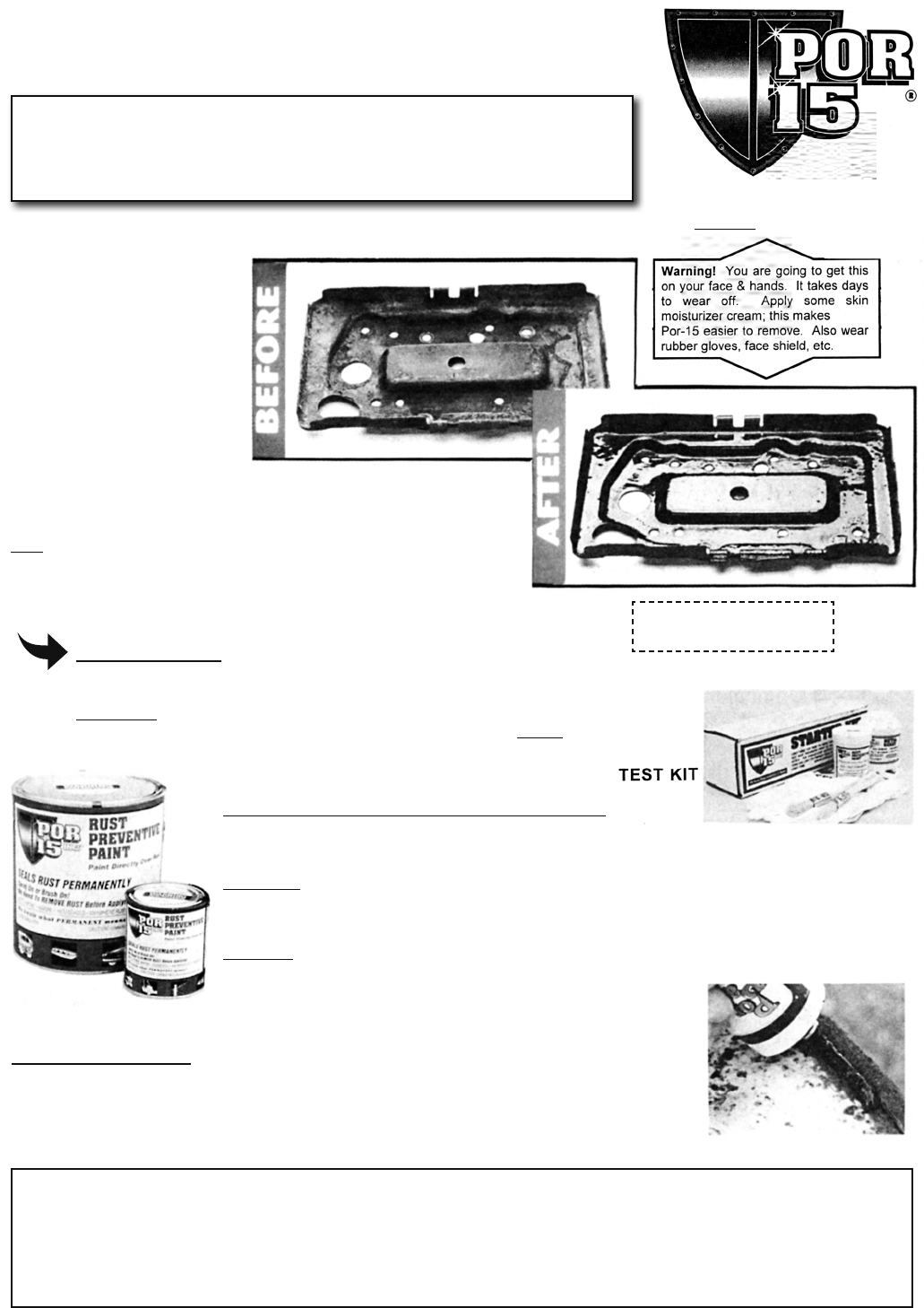 iWARNING: Products on this page can expose you to a chemical, which is known to the St ate of California to cause cancer or reproductive harm. **For more information go to www.P65Warnings.ca.gov**199POR-15 Family of QUALITY ProductsAll of the following products are produced by the same company with quality and performance being more important than a low selling price.SHELF LIFE - These items have an excellent shelf life until the can is opened, then the moisture in the air can harden it. If you open the can and do not use all of it, put into a smaller jar or can. Always clean the can lid groove and put a layer of plastic wrap on container before the cover (or you may never get it off!).POR-15 RUST PREVENTIVE COATINGPOR-15 is a gloss black paint like substance which acts as a total rust inhibitor. POR-15 chemically bonds to rusted steel to form a rock hard non-porous coating that won't crack, chip or peel. It works by isolating metal from moisture. No moisture, NO RUST! Paint right over rust on floor pans, frames, chassis, trunks or any rusty metal. POR-15 grips to rust unlike any paint you've ever seen. It dries to an unbelievably tough, ceramic-like finish.POR-15 is not a water based product (like EXTEND). POR-15 is anhydrous (made without water). It is actually strengthened and hardened by moisture. It dries faster on a humid day so moisture DOES NOT weaken it like regular rust paints. NOTHING WILL REMOVE IT short of a hammer and chisel. Gas and thinners? NO EFFECT! You can even twist the coated metal!NOTE: POR-15 must be top coated if it will be exposed to direct sunlight or it will discolor (use BLACKCOTE or CHASSIS COAT. They make it even tougher!). POR-15 and the black coatings should not be considered top coats on "visible" parts of fenders, etc. They are tough and "imperfect" for use as your final paint coating on the top of the car. REMOVE FROM HANDS IMMEDIATELY or you'll have to "wear" it off!POR-15 PRODUCTS CAN'T GO AIRMost Por-15 products must ship surface. CANNOT Ship Air. MORE INFO? Request more info., and questions & answers - C11117 free 2 oz.TEST KIT - Order this TEST "STARTER" KIT and see for yourself. I'm sure you'll be sold! KIT INCLUDES: 8 oz. of Marine Clean, 1/2 pint of Metal Ready and enough Gloss Black POR-15 to cover 12 sq. ft. (or buy the 4 oz. can below), 2 paint brushes and some rubber gloves. TEST KIT C11118 3 lbs.POR-15 Gloss BlackRUST PREVENTIVE COATINGNeed to be top coated if it will be exposed to direct sunlight.Use DIRECTLY ON HEAVY RUST. Complete instructions for brushing or spraying. See SOLVENT next page.GLOSS BLACK 4 oz. CAN C11119A 6 oz. PINT C11393 1 lb. 8 oz. QUART C11119 3 lbs. (A QUART goes a long way!) GALLON C11120 12 lbs.SEMI-GLOSS PINT C11394 1 lb. 8 oz. QUART C11395 3 lbs.POR PATCHThis is a thicker version of POR-15 (like caulking). Since it is thicker, you can use to fill metal seams, small holes, rust pits, any place you'd normally use POR-15 to stop rust. Can be painted over with POR-15. 4 oz. tube - BLACK C11125 8 oz.What Do Customers Say? We have gotten more positive comments about the POR-15 products than just about any new product we've ever had. Customers that have used it in the past had nothing but praise and were glad to be able to order from us. Those who have just recently tried POR-15 were amazed and said "this is even better than you said!"