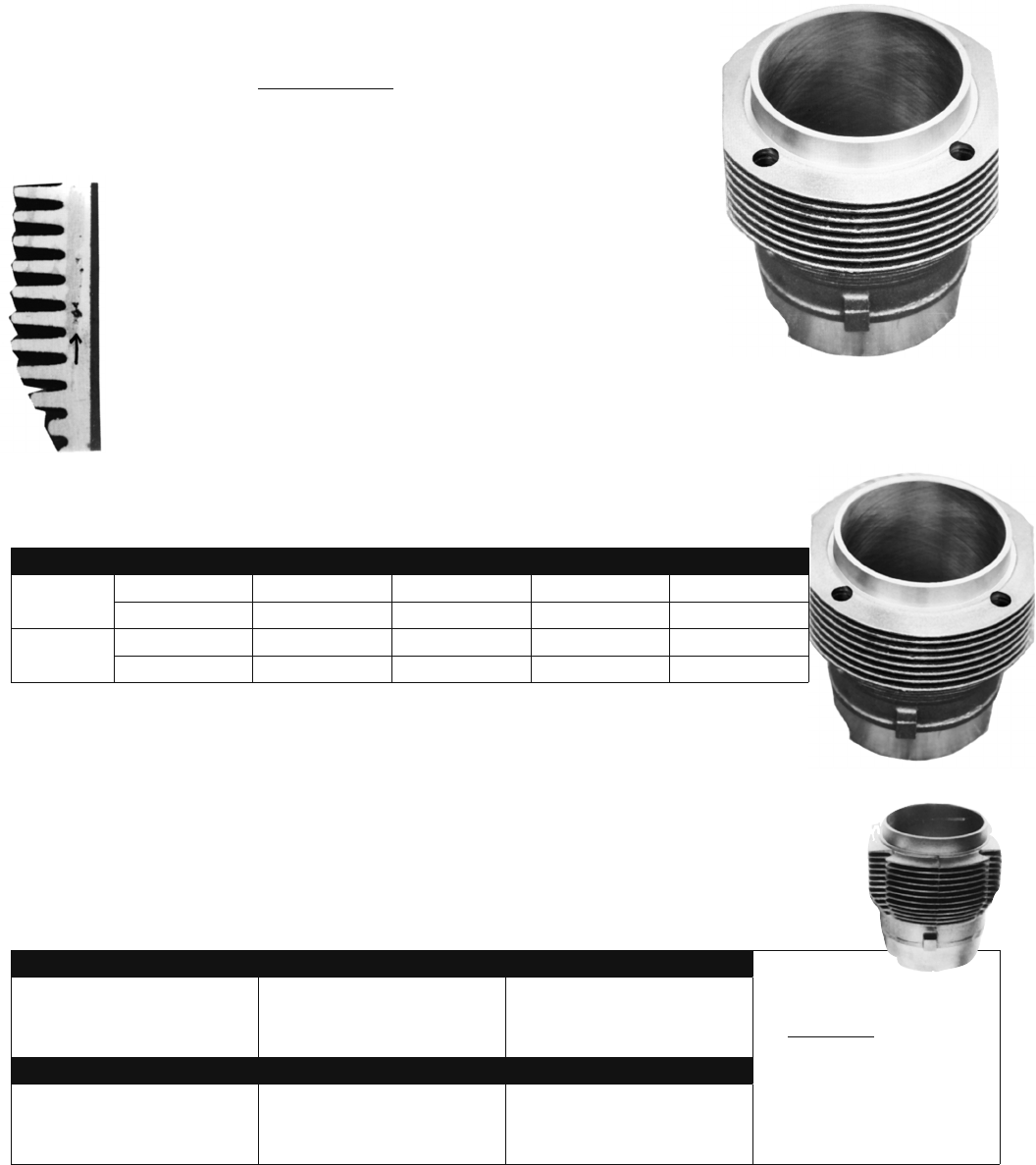 iWARNING: Products on this page can expose you to a chemical, which is known to the St ate of California to cause cancer or reproductive harm. **For more information go to www.P65Warnings.ca.gov**23B1. CLARK CYLINDER BARRELS - NEW "FULL FIN"All 6 lbs. each STANDARD +20 +30 +40 +601961-6 4220 - - - - - - 220 C11624A 220 C11625A 220 C11626A 220 C11627A280 C11623 280 C11624 280 C11625 280 C11626 280 C116271965-69220 - - - - - - 220 C11629A 220 C11630A 220 C11631A 220 C11632A280 C11628 280 C11629 280 C11630 280 C11631 280 C11632220 FINISH is usually suggested for Cast Iron & Chrome Rings. +30 or larger need big bore head gaskets.280 FINISH is usually suggested for Moly, but is OK for Cast & Chrome.See Pg 23C for Cylinder / Piston / Ring Kits with "Full Fin" Cylinder Barrels. There is NO CORE for these items.2. BORED CYLINDERS - "PREMIUM"Precision bored and honed cylinders IN STOCK. We use only cylinders with perfect fins and gasket areas. All cylinders are inspected, cleaned, blast-ed, bored, honed, oiled, sealed in plastic bags and individually boxed. (We do allow cylinders missing less than 1/4 sq. inch of fins). Your exchange set can be sent in after you have pulled your engine down (or before if you want). Don't trust your cylinders to a "should be able to" Machine Shop. These are done on machines specifically equipped for this purpose. See page 23A for photos of our equipment. We offer cylinders with 220 and 280 finish. The 220 finish is suggested for CAST IRON and CHROME RINGS. The 280 finish is suggested for MOLY RINGS. (See page 24). All prices INCLUDE A REFUNDABLE CORE FOR EACH CYLINDER. 1961-63 CYLINDERS 220 FINISH 1964 CYLINDERS 220 FINISH 1965-69 CYLINDERS 220 FINISHNOTE!+30 and larger need big bore head gaskets (stock can hang over)+20 = C2858+20 6 lbs.+30 = C2858+30 6 lbs.+40 = C2858+40 6 lbs.+60 = C2858+60 6 lbs.+20 = C2858X+20 6 lbs.+30 = C2858X+30 6 lbs.+40 = C2858X+40 6 lbs.+60 = C2858X+60 6 lbs.+20 = C2854+20 6 lbs.+30 = C2855+30 6 lbs.+40 = C2856+40 6 lbs.+60 = C2857+60 6 lbs.1961-63 CYLINDERS 280 FINISH 1964 CYLINDERS 280 FINISH 1965-69 CYLINDERS 280 FINISH+20 = C7966 6 lbs.+30 = C7967 6 lbs.+40 = C7968 6 lbs.+60 = C7970 6 lbs.+20 = C7972 6 lbs.+30 = C7973 6 lbs.+40 = C7974 6 lbs.+60 = C7976 6 lbs.+20 = C7978 6 lbs.+30 = C7979 6 lbs.+40 = C7980 6 lbs.+60 = C7982 6 lbs.DEPOSIT ON CYLINDERS: You DO NOT get YOUR cylinders back. There is a CORE DEPOSIT INCLUDED in the price of each cylinder. The CORE VALUE is listed in the PRICE LIST after the part #. Full CORE VALUE per cylinder will be refunded when we receive (prepaid) identical, unbored, per fect gasket surface cylinders with no broken fins (will accept 1 fin broken to the size of a pea). You can also ship cylinders first with your order and subtract the CORE FEE.PACKING: Cylinders are shipped in individual boxes. Please return cores in these boxes. If you can't, then wrap cardboard around each cylinder. If you stack cylinders, separate by cardboard.GM PorosityActual Photo of Our CylinderCLARK CYLINDER BARRELS - NEW "FULL FIN"We contracted with a company that has made replacement VW & Porsche cylinders for years. They are producing new "FULL FIN" CYLINDERS for us that are fashioned after the 1960 "FULL FIN" Corvair cylinders (VW & Porsche cylinders also used this configuration).It is felt that the 1960 style cylinders had SEVERAL ADVANTAGES: A. The top fins going completely around the top of the cylinder help to reinforce and provide a more stable cylinder during operation. With less distortion (especially on larger bores) the cylinders will stay truer and create less piston friction and wear. B. The additional fins may add slightly more cooling.Clark Modification: We are making the cylinder walls about .030" thicker for even greater strength. This means that if the cylinder is bored .060, it will end up at the original wall thickness. While cutting GM cylinders in half we found they varied by up to .050 from side to side. It appears GM had trouble keeping the fin tooling centered on the bore. Our supplier is doing much better! Our castings are also very dense and consistent (see "GM Porosity" in photo at left).STOCK SIZE: These cylinders will be available in stock size for customers that want to go back to stock (STD) size pistons for 1961-64 and 65-69's. All cylinders will be 280 finish. All cylinders will have the clearance notch so 61-64 cylinders will all be "64 style". See below to order.OVERSIZES: We will also offer these new cylinders in +20, +30, +40, +60. See below. CORE? There will be NO CORE FEE, but we pay for good used cylinder cores delivered to us. We include a note with the new cylinders to tell you what we are currently paying for good used cylinders.In Cylinder/Piston Ring SETS? YES! (See page 23C for ordering)CHECK WITH US FIRST - Please!If you think something is wrong with a part, call or write before you send it back or modify it. 90% of the time customers think something is wrong - it isn't. Please check with us first. If you modify a part - it's yours![