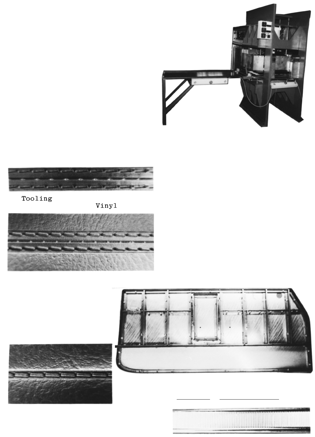![]() i WARNING: Products on this page can expose you to a chemical, which is known to the St ate of California to cause cancer or reproductive harm. **For more information go to www.P65Warnings.ca.gov** 261C VINYL EMBOSSER We thought you might be interested in our dielectric embosser which gives us complete control over all our upholstery and door panels and allows us to seal them right to the cardboard like the factory. This machine is 8 feet tall and capable of up to 30 tons pressure with no distortion (critical for good even door panels). It was custom made to our specs for our specific Corvair needs. It requires 2 electrical circuits – a small one of 208V 20 amps – 3 phase and the BIG ONE of 208V – 150 amps – 3 phase (for those of you unfamiliar with 3 phase that is equal to 208V – 450 amps single phase! ...and if that still doesn't mean much, it is enough for 2-3 average size all electric homes!). I don't totally understand the mechanics behind this machine but in gen eral it produces radio waves (similar to a microwave oven), these oscillate rapidly back and forth between the flat pressure plate and the brass rule of the tooling. In so doing, it "excites" the vinyl and filler and they in turn heat up just to the point that they "melt" and then take the "set" of the tooling pushing against them. In the case of the 1966 stitched rule below, the vinyl must flow into each small engraving to give the correct detail. The production sequence is quite simple, we can either mount the tooling to the flat pressure plate or put it on the shuttle, pile the correct material on top of it and roll the shuttle under the pressure plate. It goes basically like this: 1) Put tooling on the shuttle and load with vinyl and filler (and board for door panel). 2) Push under the machine and push starting buttons. 3) Machine puts pressure to force out any air (about 5 seconds). 4) Radio waves activate for 2-4 seconds and turn off. 5) Machine keeps pressure down for 4-8 seconds until material solidifies. 6) Remove finished product. TOOLING All our tooling is brass (considered to give the best results). Each brass bar is attached to a 1/4" machined aluminum "jig plate" and spacing and height are checked +/- .003". It took nearly 240 feet of custom made single stitched bar for the 1965, while the triple stitch for the 1966 cost $30.00 a foot and took 4 months to finish. Each detail has to be actually engraved into the brass. We currently have at least 70 different toolings to make alI the various upholstery and door panels. The tooling below is for the 1966 drivers side door. Our biggest challenges have been the 1966 stitching, the 1962 door panel mylar and the 1968-69 upholstery. We take great pride in all our upholstery items, have complete control over its production, and guarantee that you will be satisfied and have the best that is available. CHROME MYLAR The 1961, 1962, and 1964 door panels had "chrome mylar" embossed onto the door panels. Our door panels DO COME WITH the chrome mylar embossed on. Below is a section of the 1961 mylar. 1965 SINGLE STITCH – about 3 times life size. The edges are slightly out of focus due to the close-up lens.