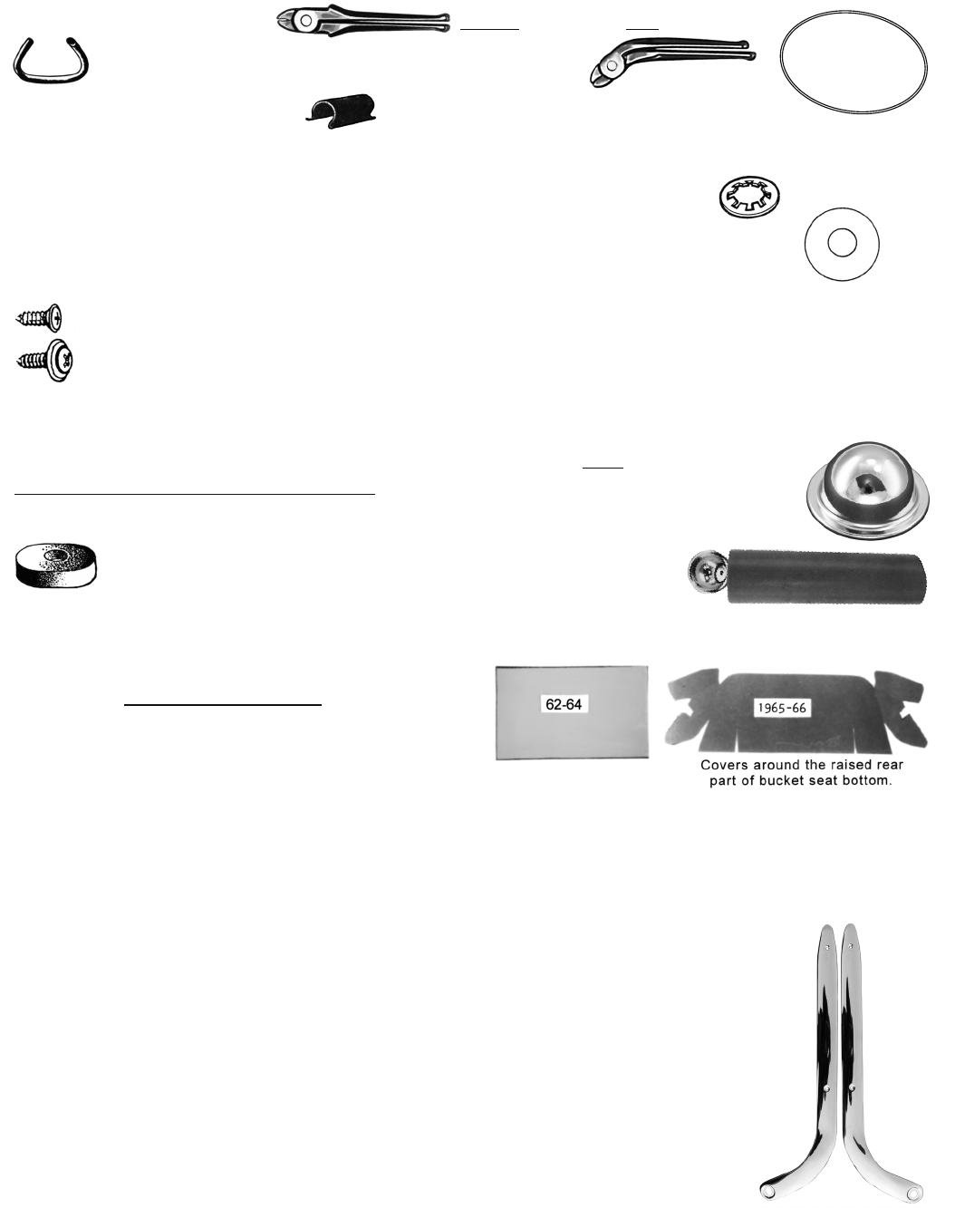 iWARNING: Products on this page can expose you to a chemical, which is known to the St ate of California to cause cancer or reproductive harm. **For more information go to www.P65Warnings.ca.gov**266UPHOLSTERY INSTALLATION SUPPLIESAll our upholstery comes with complete instructions. The following are highly suggested items that you may want to order.HOG RING PLIERS - These are used to attach the reproduction upholstery the same way as the originals. Generally you will need from 300-400 clips. These PROFESSIONAL pliers really are a must. Straight ones are suggested. Bent ones also handy but not essential. ORDER HOG RINGS SEPARATELY!PROFESSIONAL PLIERS STRAIGHT: C4879 8 oz. BENT: C6489 8 oz.HOG RINGS: Sold Set of 100 C4880 6 oz./set Sold Set of 500 C4880X 1 lb.FC (Van) UPHOLSTERY CLIPS Originals - These were used along with hog ring clips for FC in certain areas. Sold Set of 10. C5921 1 oz./setSEAT CLIPS - Holds pivot on the bucket seat back. "Impossible" to get off in good shape! "1" = Set of 2 1960-69 C4883 1 oz./setSEAT WASHERS - Used between bucket seat pivot and the vinyl to prevent damage to the vinyl. Sold each. Not original material. 2-4 needed per bucket seat depending on year. Also fit Car & FC front bench seats. C4884 1 oz. ea.FRONT SEAT ADJUSTER HELPER SPRING - 1962-69 with bucket seats - either side. C3252 4 oz. 1961-65 FC (Vans) C3247 4 oz.UPHOLSTERY SCREWSORIGINAL STYLE for 1966-69: Cone washer just extends away from head of screw. Sold Set of 10. C4336 2 oz./set OVERSIZE WASHER: Original for some 1965's - Same as C4336 but washer is slightly LARGER in case original had pulled through upholstery. Sold Set of 10. C4337 2 oz./setLARGER STYLE WASHER & SCREW: (see picture) Also fit 1960 package area. Set of 10 - C1216A 4 oz./set OVERSIZE SCREW (Set of 5) - C4338 2 oz./setSEAT PIVOT CAPS - Yes! Those little chrome "caps" that fit over bottom pivot on bucket seats. The ones that you usually cuss at and bend. 2 needed per car. 1960-66 ROUND ones are EXACT REPRO - ROUND - C1748 1 oz. ea.Seat Pivot Cap Installation ToolThis piece of tubing fits the chrome caps that fit over the pivot on the bucket seat perfectly and installs them without damage. Very difficult to install without this tool. C6587T 4 oz.SEAT BUMPERS - See page 234 SEAT BUNS next pageSEAT EXTENDERS - For tall drivers. These only fit stock bucket seats and stock bench seats. This will allow for greater front leg room. 1 Set is enough for (1) bucket seat or (1) bench seat. Bolts to old holes and moves seat back about 3". Adjustment still works. Does not fit 1960-61 Cars or Vans. C8256 7 lbs.R SEAT "CARDBOARD" - 1962-66 NOT INCLUDED WITH UPHOLSTERY.Bucket seats had a "cardboard" piece that helped cover sharp areas on the bottom. Highly suggested as the old ones are usually bad. 1 needed per bucket seat. Sold each. 1962-64 - C7512 8 oz. ea. 1965-66 - C7513 10 oz. ea. COTTON PADDING - Most bucket seats and some rear seats have sections of cotton placed over the foam at the factory. It helps to give a "full" appearance. This cotton is usually flattened and new is suggested. SEE PAGE 265AFOAM PADDINGYou may want some of this to give fullness to a seat, sound-proofing, etc. The 7/16" semi-firm is most useful (the soft is too soft to give much fullness; it just collapses). SEMI-FIRM FOAM - Sold by the square yard. 1 = 1 square yard, 2 = 36" X 72" C13085 3 lbs. Free Sample - C13086 1 oz. SOFT FOAM - 3/4" thick, but very soft. Approximately 22-24" wide. "1" = 12" x 24"; "2" = 24" x 24"; "3" = 35" x 24", etc. C5671 8 oz./ft. -- MORE FOAM - SEE PAGE 265B --FELT & JUTE - The felt is approx. 1/8 " thick by 24" x 56". It is used in some areas of upholstery installation as a padding. There is also a piece of jute padding 8" x 12" which usually is not needed. C7032 1 lb.BUCKET SEAT TRIM - Beautiful chrome repros for '60-'66 Bucket Seats Replace those pitted, scratched or dented trim pieces. Fit outside of right & left bucket seats (sold as a pair). These will not fit the inside of seats. These qualify for the interior discount. Also order seat pivot caps (C1748) sold each. C5349T 4 lbs./pair GLUES - see bottom of page 268j C6587TC1748ALL ITEMSPgs. 264-288 qualify for Interior Discountsee Blue pg. MK-2C5349TC4883C4884C7512
