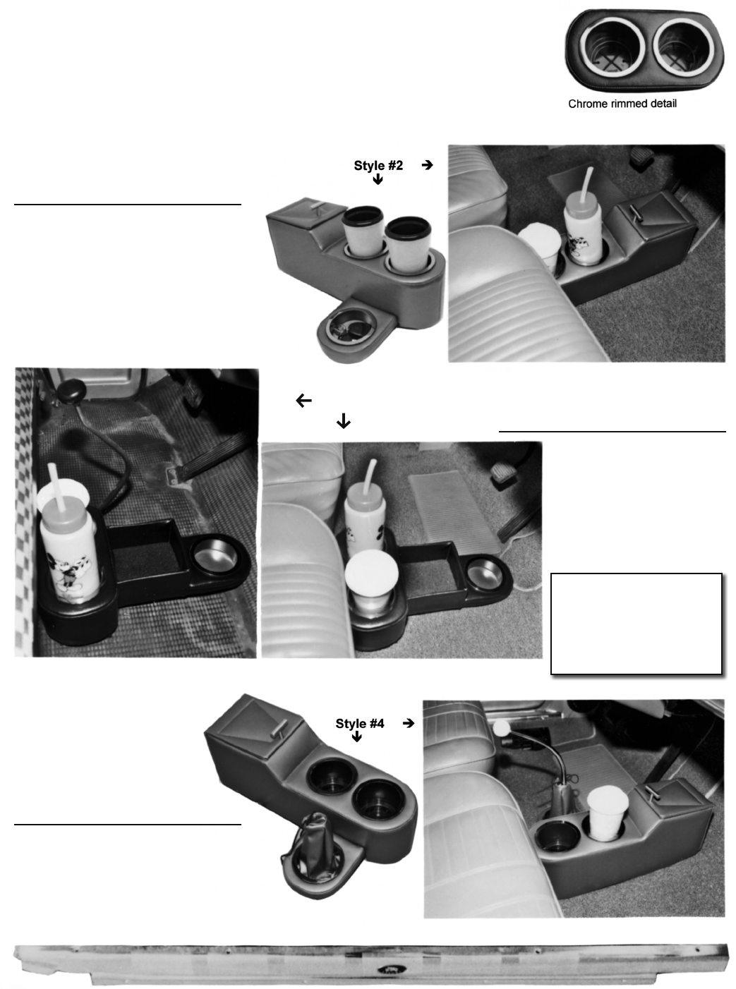 etc. All have 2 cup holders that are chrome rimmed to add to the original "60's look". You may also want to