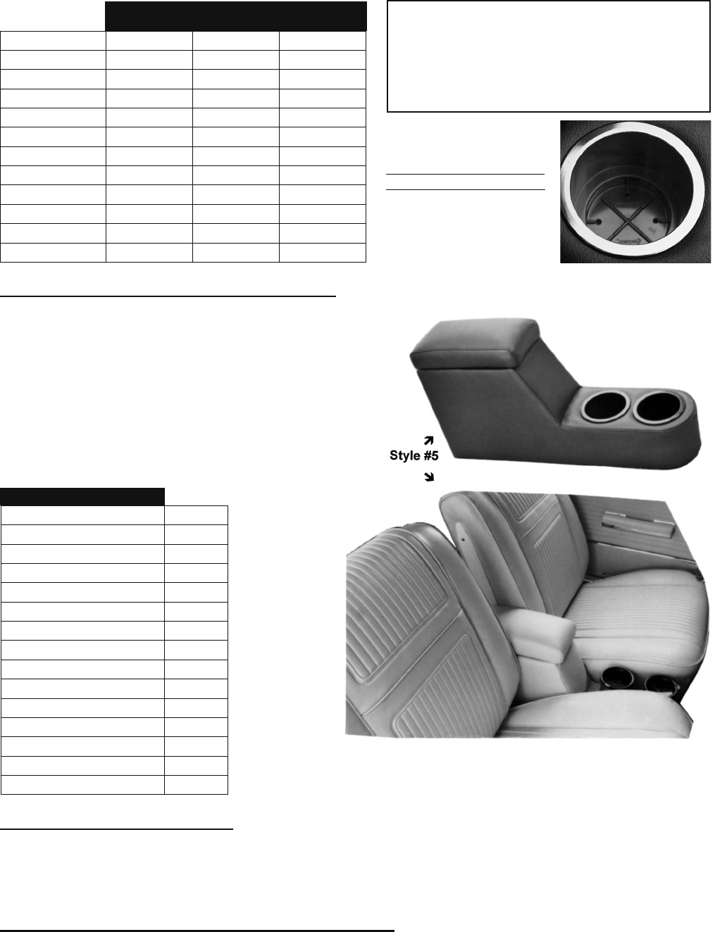 iWARNING: Products on this page can expose you to a chemical, which is known to the St ate of California to cause cancer or reproductive harm. **For more information go to www.P65Warnings.ca.gov**269CORDERING 60-64 CONSOLES (STYLES 2-4)STYLE #2Cars 10 lbs.STYLE #3Cars & FC 9 lbs.STYLE #4Cars 10 lbs.60-61 Met Green (HG) C12741 C12729 C1271760-61 Met Blue (HLA) C12742 C12730 C1271862-64 Met Blue (HLB) C1 2748 C12736 C1272460-62 Red (HRA) C12743 C12731 C1271963-64 Red (HRB) C12750 C12738 C1272660-64 White (HW) C12745 C12733 C1272160-64 Black (HB) C1 2744 C12732 C1272062-64 Aqua (HQ) C1 2749 C12737 C1272563-64 Saddle (HA) C12751 C12739 C1272760-64 Fawn (HF) C12746 C12734 C1272264 Off-White (HE) C12752 C12740 C1272862 Yellow Gold (HY) C12747 C12735 C12723CONSOLE INFO for 60-64 CARS & 61-65 FCSTYLES 2-4-- SEE PREVIOUS PAGE -- Replacement Chrome Lip Cup Holders for ConsolesCan be difficult to remove. C13364 6 oz.C1336465-69 CONSOLES (STYLE #5)65-69 Cars w/Bucket Seats & Std or PGThis console really looks factory. It fits between bucket seats, forming a padded, lined armrest/storage area (8" x 4 1/2" x 7" deep). The cups are also held between the seats. Note: the 67-69 seats are about 1" farther apart so the console is not held quite as tightly but there is velcro on the bottom to prevent excessive movement.*67 gold is the only console that is not Clark vinyl - it is close & looks nice.Additional note for 65-69 Bucket & Bench Seat PG Cars. You can actually use style #3 above, but the vinyls will be early pattern vinyls.ORDERING 65-69 CONSOLES (STYLE 5)All 12 lbs.65-69 Black (HB) C1275565-67 Red (HR) C1276365-67 White (HW) C1275365-67 Lt. Fawn - Off-White (HT) C1275465 Met Blue (HL) C1276165 Slate (HG5) C1276065 Saddle (HA) C1276266-67 Bright Blue (HH) C1275867 Gold (HY) *see note aboveC1275966-67 Aqua (HQ) C1275766-67 Bronze (HZ) C1275668 Med Blue (HHC) C1276568 Ivory Gold (HG) C1276469 Blue (HD) C1276769 Green/Gold (HHG) C12766PHONE ORDERSOur phone people give the description, price and any hints Cal suggests. You may realize you've ordered the wrong part or forgot an important part. It only takes a couple extra seconds.ZOOM! Our website catalog pages a little small? Most web screens can zoom to make the image larger.GENERAL ONLINE ORDERINGONLINE ORDERING: If you are manually entering our part number, enter the number without color code (find color in color drop down menu or listed below in "additional items"). IF YOU ARE USING THE ONLINE CATALOG - Just click on the part number and use the drop down color menu. In many cases, the same item is listed below with other color options (such as carpets in 80/20 or cut pile).
