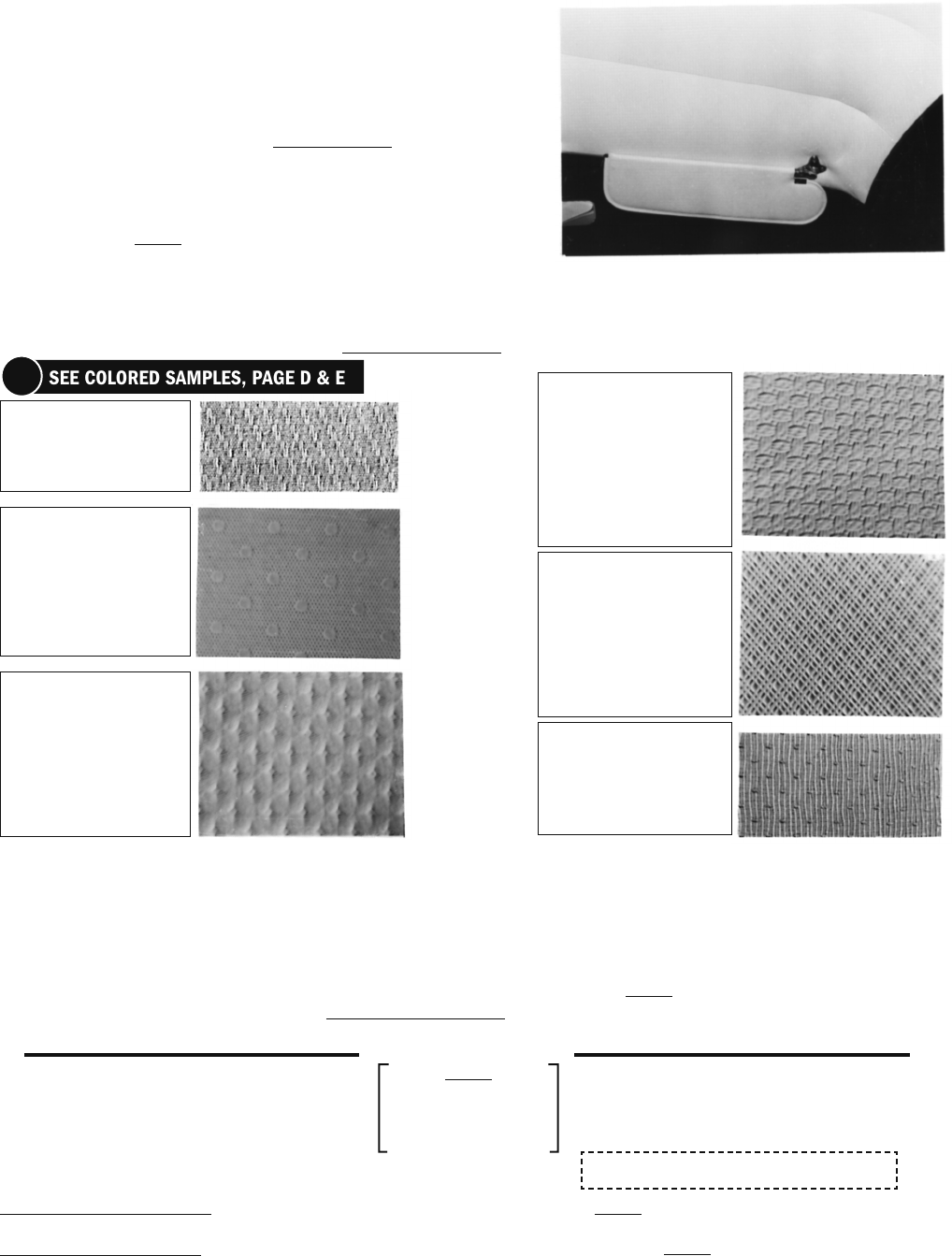 iWARNING: Products on this page can expose you to a chemical, which is known to the St ate of California to cause cancer or reproductive harm. **For more information go to www.P65Warnings.ca.gov**283CAR HEADLINERSPatterns - All our headliner patterns were made from originals. This is the only way to insure that every headliner is exactly oriqinal and that the new one fits right.Colors & Fabrics - We offer you a good selection of original reproduction material and non-original. Most of these were custom made for us exclusively.Installation - All headliners come complete, ready to install. We include detailed instructions and necessary glue. INSTRUCTIONS ONLY - C6955 1 oz.Sunvisors - You may also order material to recover your sunvisors, but we suggest you See page 267.Samples - We will gladly send samples. Just request desired ones on an order or send a self-addressed stamped envelope. Order SAMHL- Code (ex: SAMHL-HW) ON WEB - Click on SAMHL- options display below.Returns - NO RETURNS DUE TO COLOR. Send for a FREE sample first.1960-61ORIGINAL CLOTHSee the top of page 284 to order.1960-63 MONZABLACK HWWHITE HX LIGHT BLUE HZ1962-63 500 & 700We do not have originals.Choose from this page.1964 MONZABLACK HGWHITE HHTAN HJLIGHT BLUE HK COPPER HM1965-66 MONZABLACK HNWHITE HPRED HRBRIGHT BLUE HTBBEIGE HVBRONZE * HBZALSO SEE "NON-ORIGINAL"* HBZ: 1966 Bronze Limited Color. ADD HBZ to end of part number. Higher cost.USED ON THESE YEARS & 1964-500, 700 MODELS1965, 1966, 1968-500 1968-69 MONZABLACK HAWHITE HBEDARK BLUE (68-69) HCLIGHT BLUE HDLIGHT AQUA HEGREEN-GOLD (68-69) HFE 68-69 dark blue is NOT as dark as original.1967 MONZABLACK HYGOLD HOBRIGHT BLUE HYBORIGINAL HEADLINER FABRICSWe have had these reproduced so they equal the factory original. Some materials and colors were used for several years and Models (we may have even missed some applications). If you need one that isn't listed - send us a small piece and we will see if we can help. Pictures are enlarged. CHART OF ALL HEADLINERS - C7071 6 oz.NON-ORIGINAL HEADLINER FABRICSMany people like these for a change. Please send for a samples first. NO RETURNS DUE TO COLOR, OR MATERIAL.Black Perforated B White Perforated J (Perforated cannot be used for recovering sunvisors as glue comes through the holes.)MORE 1965-66 MONZA COLORS - ORIGINAL STYLE - NON-ORIGINAL COLORS (non-orig for 60-64 click any color, put non-orig in comments) Med. Blue - HMB Dark Blue - HDB Aqua - HAQ Dark Green - HDG Tan - HTT Brown - HTBB Lt. Gray - HTGPrices - All fabrics (except cloth, HBZ) are the same price. If you have a special fabric (send sample first), we will make a headliner using your fabric for the same price. FREE SAMPLES - ADD color code to SAMHL- (ex: SAMHL-HG). ON WEB - Click on SAMHL-, choices below.CHART OF ALL HEADLINERS - C7071 6 oz.1960-64 HEADLINERSAdd Fabric Color Code to end of Part Number.1960-64 COUPES (2-Door) *C4506 5 lbs.1960-64 4-DOOR C4507 5 lbs.1961-62 WAGONS C4508 5 lbs.1965-69 HEADLINERSAdd Fabric Color Code to end of Part Number.1965-69 COUPES (2-Door) C4509 5 lbs.1965-66 4-DOOR *C4510 5 lbs.1967 4-DOOR *C4511 5 lbs.* j Also see cardboard installation pieces top of next page.HEADLINER MATERIAL - Original or Non-Original - ADD color code to end of part number. ON WEB - Put color & year in comments. (Cloth materials ADD color codes from page 284 to end of part #.) SOLD PER YARD. 54" wide. C7458 1 lb./yd.SUNVISOR MATERIAL - This will give enough material to cover 2 sunvisors. Be sure to give Color Code. ON WEB - Put color & year in comments. Cloth material use COLOR CODES from page 284. C3039 8 oz. We suggest NEW visors. (see page 267)FC (Van) HEADLINERS - See page 271BOnline Ordering - See page 269CSEE COLORED SAMPLES, PAGE D & ENON WEBClick on part #, color drop down, for color not listed, click color XXX & put color in comments in cart.