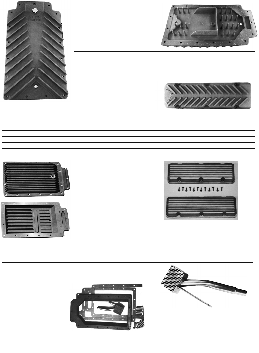 iWARNING: Products on this page can expose you to a chemical, which is known to the St ate of California to cause cancer or reproductive harm. **For more information go to www.P65Warnings.ca.gov**30OTTO Parts PansOTTO oil pans and valve covers have an attractive matching fin pattern. Produced from heat treated black anodized aluminum, these have been desirable units for over 30 years. The oil pan adds 1/2 quart cap acity and comes with all hardware and a magnetic drain plug. We also suggest the oil pick-up and baffle spacer below.ORDER GASKETS SEPARATELYOTTO Oil Pan C7996 10 lbs.OTTO Oil Pan with Polished Fins C8608 10 lbs. "Paper" Pan Gasket C3937 6 oz. Optional "Paper" Gasket C3033P 6 oz. All RUBBER Gasket (Cal's preference) C3129 6 oz.OTTO Valve Covers: Sold as a pair with hardware. 4 Hole Covers C7999 8 lbs./set ** ORDER GASKETS SEPARATELY.** 4 Hole Covers (Polished Fins) C8709 8 lbs./set 6 Hole Covers C7997 8 lbs./set 6 Hole Covers (Polished Fins) C8710 8 lbs./setValve Cover "Paper" Gaskets: 6 hole. Use for 4 or 6 hole covers. C3941 6 oz./pairOptional "Paper" Gasket: May seal better. C3033V 2 oz./eachSet of 4 Bolts for 1 side : Come with covers. C6909 4 oz. ECONO Aluminum Oil Pan ECONO Aluminum Valve CoversThis is a nice aluminum pan for those of you who want a pan for less money. They have fins inside as well as out and do a satisfactor y job dissipating heat. Finish is bare, sandblasted aluminum but not as thick as Clark or OT TO pans. lncludes: Oil pan, shake proof mounting bolts and magnetic drain plug.C8682 10 lbs.ORDER GASKET SEPARATELY IF NEEDED:C199T 6 oz.An oil pick-up baffle is suggested. You can fabricate from sheet metal and attach to the cross rib on pan. Construct similar to one on stock pan.Matching valve covers for the ECONO oil pan. Includes: (2) valve covers, shake proof mounting bolts.4 Hole Type C7884 8 lbs./set6 Hole Type C7884-6 8 lbs./setORDER GASKETS SEPARATELY IF NEEDED:4 Hole Type C3018 4 oz./each6 Hole Type C6119 4 oz./eachAdds 1 Qt. capacityOil Pan Baffle Spacer - All Oil PansThis baffle ADDS 1 quart capacity while it helps control oil slosh to the sides. KIT comes with black anodized spacer, special deeper oil pickup and self-locking bolts. Also order (2) gaskets.NOTE: A slight amount may have to be ground off the inner edge of the baffle to clear some internal fins on the CLARK PAN.Baffle Kit : All Aluminum Pans C7998 3 lbs."Paper" Pan Gasket: 2 needed C3937 6 oz.Optional "Paper" Gasket C3033P 6 oz.All RUBBER Gasket C3129 8 oz.Oil Pick-Up - All Aluminum PansThese special performance oil pick-ups get the cooler oil from the bottom of the pan. The design also helps capture oil under hard turns. Stock Pick-up will work.Clark, OTTO, Econo & Ieco Pans Oil Pick-Up C3938 1 lb."No Name" 2 & 3 Quart Pans Oil Pick-Up C8627 1 lb.