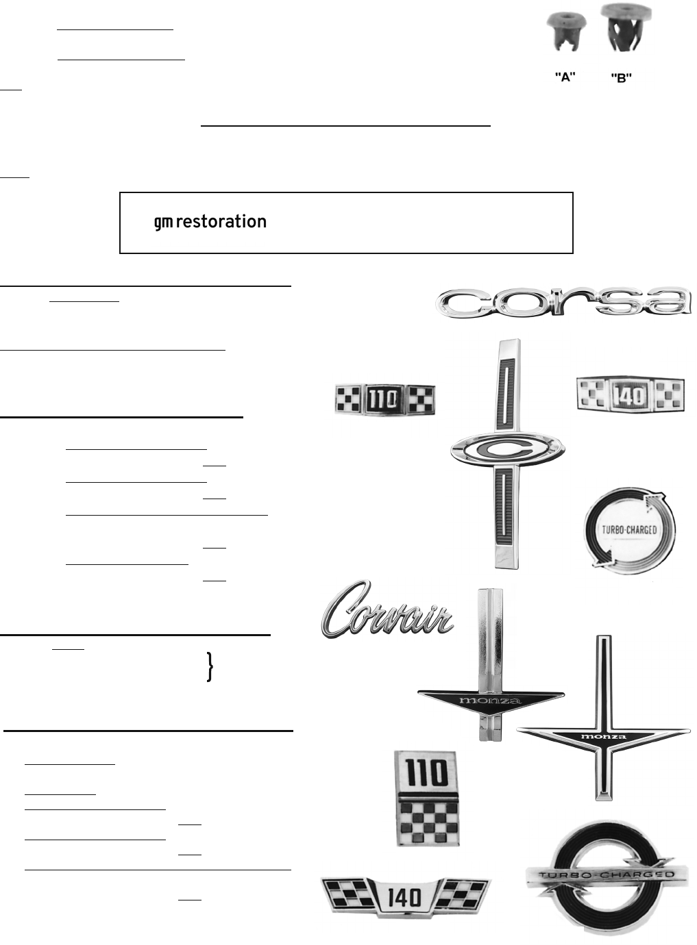 iWARNING: Products on this page can expose you to a chemical, which is known to the St ate of California to cause cancer or reproductive harm. **For more information go to www.P65Warnings.ca.gov**308LATE MODEL TRIMEMBLEM CLIPS - RETAINERS - 1965-69 NOT SUPPLIED WITH MOST EMBLEMS "A" CLIPS - "CORSA" FENDER SCRIPT EACH - C570 1/2 oz. ea. SET OF 10 - C570A 2 oz./set "B" CLIPS - FOR ALL PUSH IN EMBLEMS (exc. "CORSA" script) EACH - C571 1/2 oz. ea. SET OF 10 - C571A 2 oz./setNuts - As used on the 65-69 script "Corvair" emblem & "Corsa" Sold Set of 4 - C6179N 2 oz./set1965-69 EMBLEMSMost of the original emblems are no longer available but . . . Clark's Corvair Parts, Inc. has made some beautiful reproduced ones. Complete satisfaction guaranteed. Clips not included with emblems (except C76, C85, C86). Order above.2nds are nearly perfect. Just a speck of paint missing or slightly defective chrome.Reproduction emblems below are licensed GM Restoration Parts.CORSA SCRIPT EMBLEM - 1965-66 CORSA FRONT FENDER EMBLEM - either side. (Clips included) C76 6 oz.Corsa "C" Emblem - 1965-66 CORSA ORDER "B" CLIPS ABOVE. C2233 6 oz.1965 EMBLEMS ORDER "B" CLIPS ABOVE. 1965 110 REAR DECK LID EMBLEM C4941 6 oz. 2nds C7922 6 oz. 1965 140 REAR DECK LID EMBLEM C3485 6 oz. 2nds C7923 6 oz. 1965 TURBOCHARGED REAR DECK LID EMBLEM All are 2nds. Chrome in center not perfect. 2nds C2235X 6 oz. 1965 MONZA FENDER "CROSS" C74 6 oz. 2nds C7924 6 oz.1965-69 EMBLEM"CORVAIR" SCRIPT EMBLEM - Comes with nuts. FRONT HOOD 1965 REAR HOOD 1965-69 C85 6 oz. 2 STUDS 1966-69 EMBLEMS ORDER "B" CLIPS ABOVE. "CORVAIR" SCRIPT - 1966-69 - Front C86 6 oz. 3 STUDS Comes non-original with nuts. (Appears same as C85 above) MONZA CROSS - 1966-69 C75 6 oz. 110 REAR DECK LID EMBLEM C4000 6 oz. 2nds C7926 6 oz. 140 REAR DECK LID EMBLEM C2239 6 oz. 2nds C7927 6 oz. 1966 ONLY - TURBOCHARGED REAR DECK LID EMBLEM C2236 6 oz. 2nds C7928 6 oz.C85 & C86C76C74C75C2233C570 C571C3485C4941C2235XC2239C2236C4000