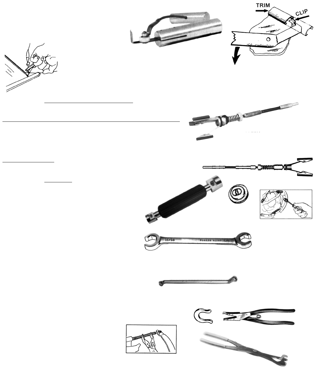 iWARNING: Products on this page can expose you to a chemical, which is known to the St ate of California to cause cancer or reproductive harm. **For more information go to www.P65Warnings.ca.gov**332WINDSHIELD REMOVAL TOOLS - 1965-69TRIM REMOVER - Removes front or rear windshield molding trim from clips with no dents! C767A 8 oz. ALSO SEE CLIPS - Page 209WINDSHIELD KNIFESuggested model C1444X 10 oz.Well designed knife for easy cutting of old windshield seals.One person operation, no need for broken wires, (2) people, etc. REPLACEMENT BLADE FOR C1444X C1444XA 1 oz.BRAKE TOOLSHONES - BRAKE CYLINDER & MASTER CYLINDERHave a perfect surface for your rebuild. Anyone can do it - all you need is a 1/4" or larger electric drill. 3-Stone Brake Cylinder/Master Cylinder HoneThis 3-Stone hone gives a smoother, faster hone than a 2-Stone. Fits all Corvairs. 240 Grit stones; 1 1/8" long. Hone C725H 10 oz. Set of 3 Replacement Stones C725HR 2 oz.2-Stone Style 1/2" - 2 1/4" range. All Corvairs (including 1967-69 dual master cylinder). C896T 10 oz. Pair - Extra Stones C896X 4 oz.SHOE RETAINING SPRING REMOVERThe round hold down spring with slotted cap. Worth twice the price! C663 10 oz.FLARE NUT WRENCHBest way to remove and protect brake and gas line nuts. 3/8 - 7/16 C3203 6 oz. 1/2 - 9/16 C3204 6 oz. 5/8 - 11/16 C3205 6 ozBRAKE BLEEDER WRENCHMakes it easier to get to the wheel cylinder bleeder valves. Fits All Corvairs (3/8" & 5/16") C5894 4 oz.HORSESHOE LOCK RING PLIERS & LARGE TRANS SNAP RINGS (Clips)Rugged plier to spread horseshoe lock rings on emergency brakes, etc. 8" long 1 3/8" maximum spread. Also large trans snap rings. C5557 1 lb.EMERGENCY CABLE INSTALLERThese pliers press the emergency cable spring back so the cable can easily be installed into the lever. C7661 1 lb.TIPS, INSTRUCTIONS, HINTS!We sell more than just parts - 100's of our parts also come with instructions, hints, or just generally helpful information. All prices, pictures, specifications subject to change without notice.(3/8 - 7/16 and 1/2 - 9/16 most important)C1444XC767AC725HC5557