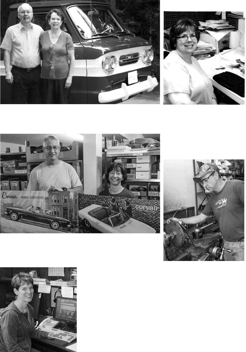 ![]() 414 Cal & Joan with the Rampside they finished restoring in 2012. It was purchased in 1974 & used as the company truck for many years. We consider ourselves “semi- retired” and like to bike, golf, ski, cut firewood, travel & restore our cars. Thanks to your support Clark’s Corvair Parts is planning on even more repros in the future. Sharon (Co-Manager) started working for us right out of high school in 1977. She orders from our suppliers, assists with office procedures, handles employee benefits, helps oversee special projects & training, and sometimes takes phone orders. Happy Retirement!! Cathy and Mark (married since 1998) decided to travel the country in their truck and trailer & spend more time with their family. Cathy was with us 41 1/2 years and Mark 35 years. They not only allowed Joan & Cal to become semi-retired but also organized and lead Clark’s Corvair Parts for over 3 decades. We all thank them and wish them the very best. Barb has been with us since 1989 and is a managerial assistant in charge of ordering from 100’s of suppliers, researching and assisting Sharon. John checks every rebuilt flywheel for minimum runout. He has been with us since 1992 and is a co-manager with Sharon. Among many duties he oversees all manufacturing, rebuilding and upholstery. He answers tech ?s, takes care of upkeep of the buildings, plows snow and still has time to do some manufacturing.
