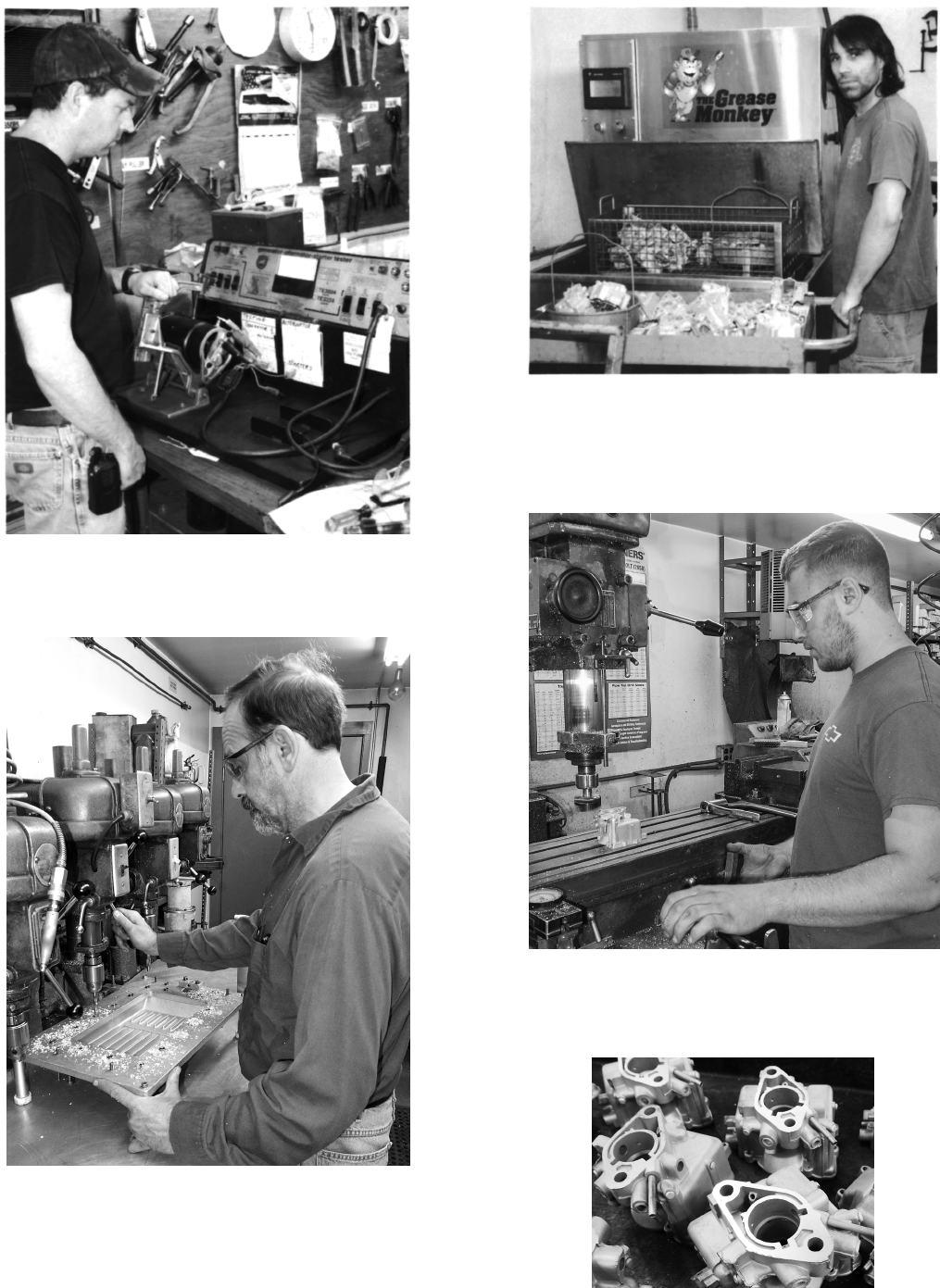 ![]() 419 Building #3 is where we do our rebuilding and manufacturing. These photos will show you some of the equipment in this building Jay gets ready to use our ULTRASONIC parts cleaner uses aluminum specic chemicals heated to 180 degrees. Parts are agitated up, down and "scrubbed" by ultrasonic vibrations, giving us perfectly clean carbs, PG Trans. parts, heads and other aluminum parts. John is load testing a generator. We rebuild and test all our starters, generators and alternators. WE WANT IT RIGHT! Kurt started with us in 1986 and has done just about every job in the shop as well as rebuilding 100’s of turbo & turbo carbs and answering tech ?s. Here he’s using a jig plate to drill holes in an aluminum oil pan. Liam rebuilds about 500 Corvair carbs per year. He mills the bottoms of each carb so they are as at as when they were new, just one of the many steps to make our rebuilt carbs as good as possible.