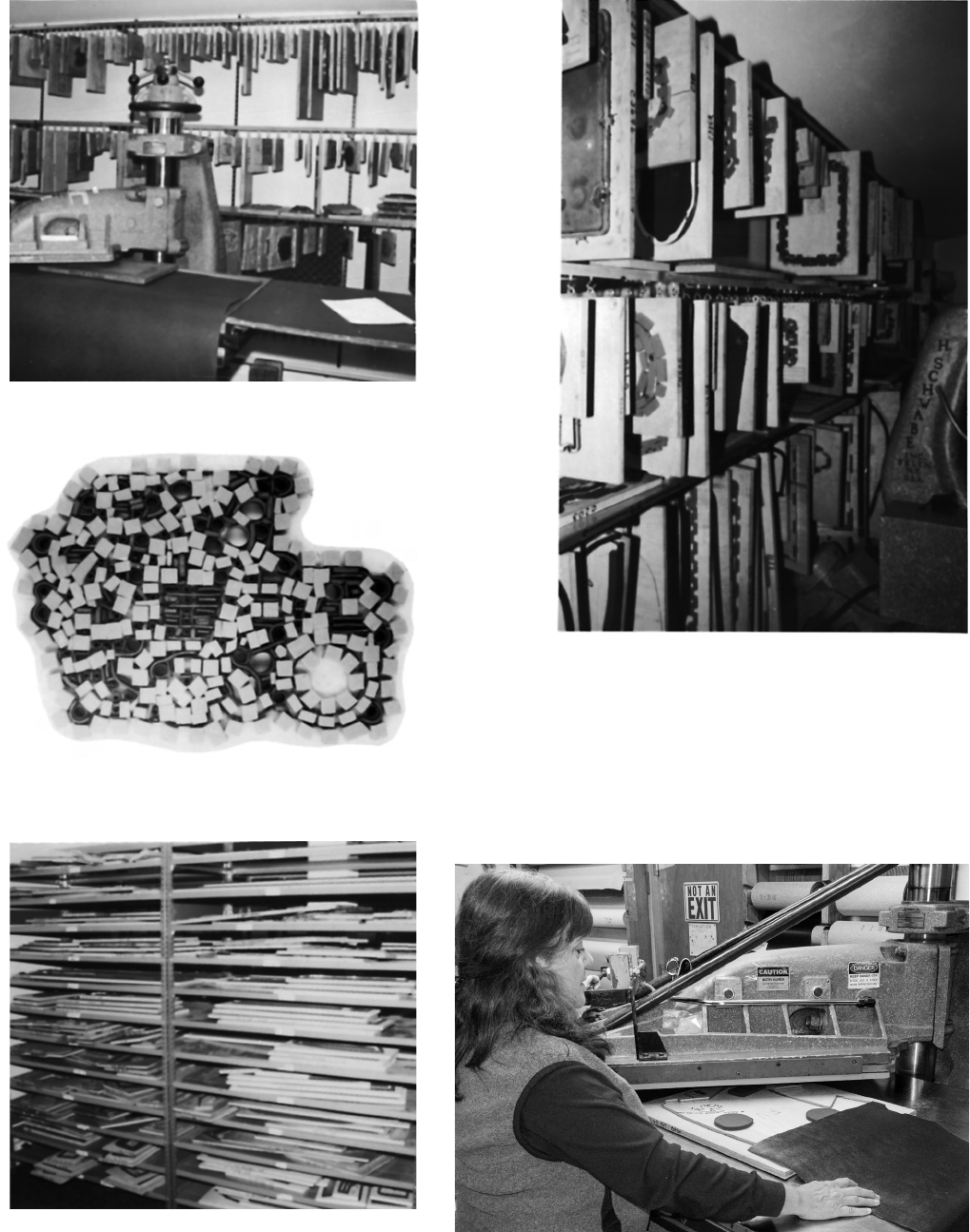 ![]() 421 Building #4 – Gasket Cutting and Upholstery When you rst enter this building you see our 2 die cutters and over 600 steel rule dies. Some only a few inches square and some are as large as 4 feet x 5 feet. Gasket cutter and tooling. Some of our engine and transmission gasket tooling. This tooling for cutting a powerglide gasket cost over $900.00 in 1990. We have 5 shelves of tooling just for cutting upholstery and door panels, carpets, package areas and kick panels. Most made by Cal, Sr. Lori is die cutting vinyl for an upholstery set. Nearly all upholstery is die cut so each piece is always exact. If you want it done right • • • That's why we cut all our own gaskets, do all our own upholstery, door panels, headliners, top boots, rebuilds and many, many other jobs.