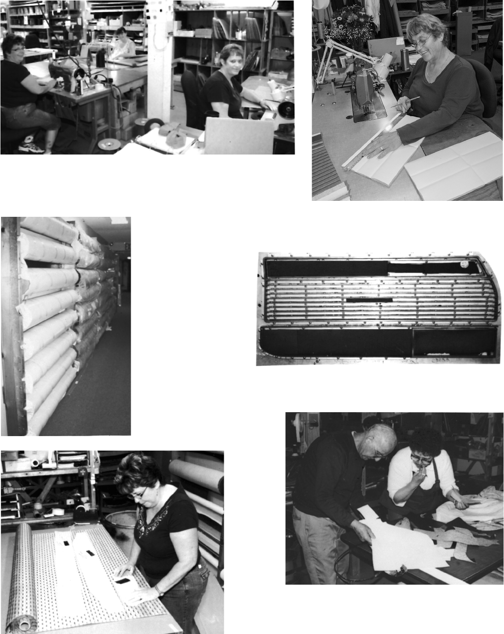 ![]() 422 Building #4 – Sewing and Embossing About 80% of this building is involved in production of our show winning interiors. We do everything ourselves (except make the vinyl!). Pearl Lori Donna 3 of our 6 sewing machines. The sewing section is about 15 ft. x 60 ft. with shelves and shelves of binding, thread, and listing (& our sewing staff). Donna says she loves to come to work, every day is a challenge and she feels so proud when completed upholstery sets are on the way to the customer. Most upholstery shops stress speed, Clarks stresses quality. VINYL & HEADLINER rolls must be on racks to store it correctly. We have OVER 600 rolls on racks attached to the walls. This photo shows just 24! Tooling to produce a left 1965 door panel. It would probably cost about $15,000-20,000 to replace this tooling. Pearl is getting ready to make an original fabric upholstery set. At $100-200 per yard, she'll double check before cutting! Cal, Sr. and Anna checking a pattern. Circa 1990. Each original interior has been carefully taken apart and documented in a binder. Everything has been recorded since 1982, right down to the type of stitching to use. Anna led our upholstery department for over 18 years until her retirement in 2004.