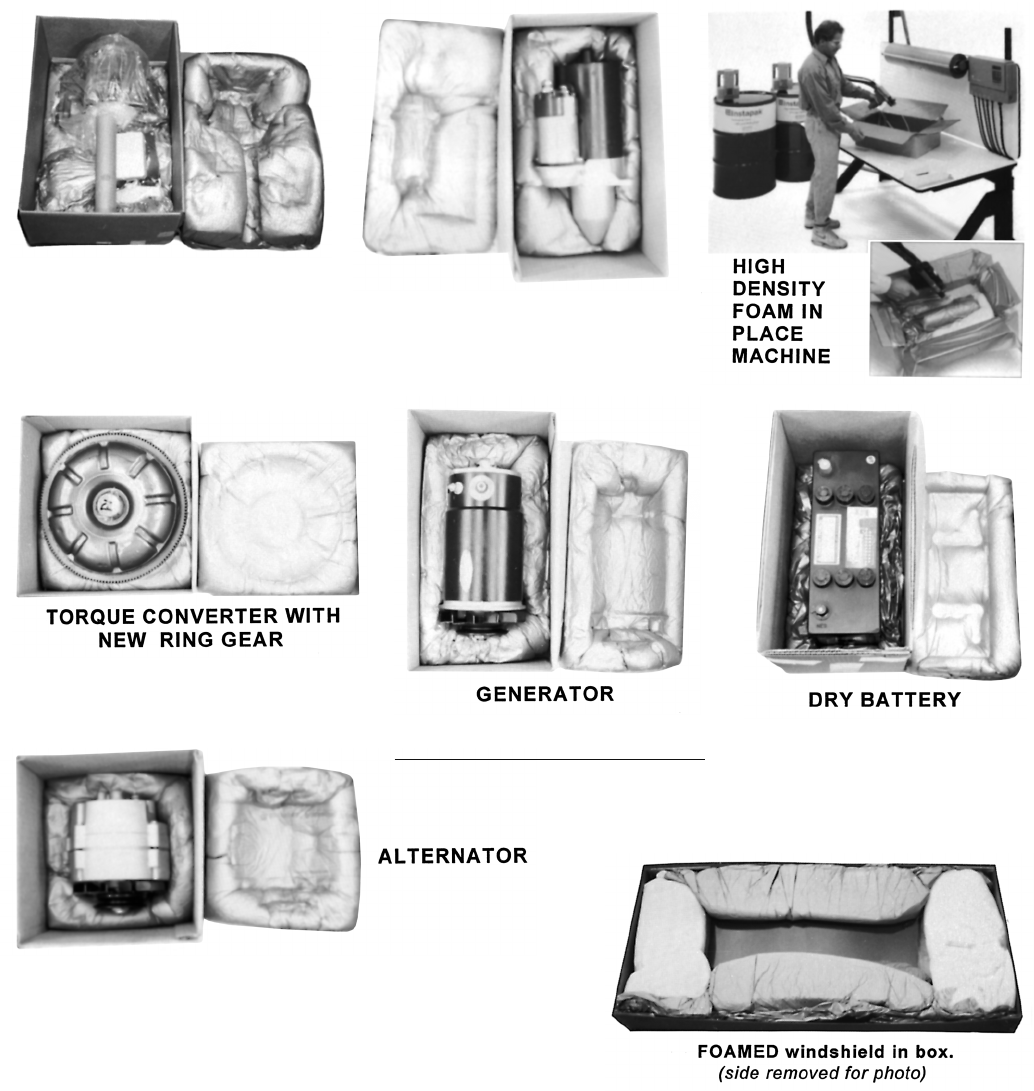 ![]() 425 FOAM in Place PACKING In our continuing effort to pack items even better, we have added this foam in place machine to pack a few "problem" items. Most of these items are heavy and difcult to keep in place within a box. It also occurred to us that most of these items have a "core" value (you need to box and return them). Therefore, we also designed special, stronger boxes, so not only will the parts get to you in perfect condition but you'll now have a great box and packing to return the core to us. (Open the top of the box, pull out the upper half of the foam, remove the new part and replace your used one and the foam on top. Reseal and ship back.) PARTS GET TO YOU IN PERFECT CONDITION. USE THE BOX & FOAM TO RETURN YOUR USED CORE. REBUILT PG TRANS. can now safely be shipped in a double wall 350 Lb. test box with foam! CLARK quality REBUILT PG TRANS. gets OVER 50 NEW parts, gaskets, bushings, etc. ENVIRONMENTALLY FRIENDLY: Does NOT produce CFCS or HCFS. Not only can this material be reused but it is highly compressible, landll compatible and can be burned in waste to energy plants. WE ALSO FOAM CRANKSHAFTS FOAM in place PACKING Ship 1960-69 (including Van & Wagon) WINDSHIELDS UPS TO Zone 8 for 220 lbs. plus UPS large package surcharge. Packed and shipped UPS for 220 lbs. shipping (due to dimensions) plus UPS large package surcharge. Our windshields get to you quickly and safely. The Price List includes the foam in place packing and special box. "YOU expect more from CLARK'S and you GET MORE"