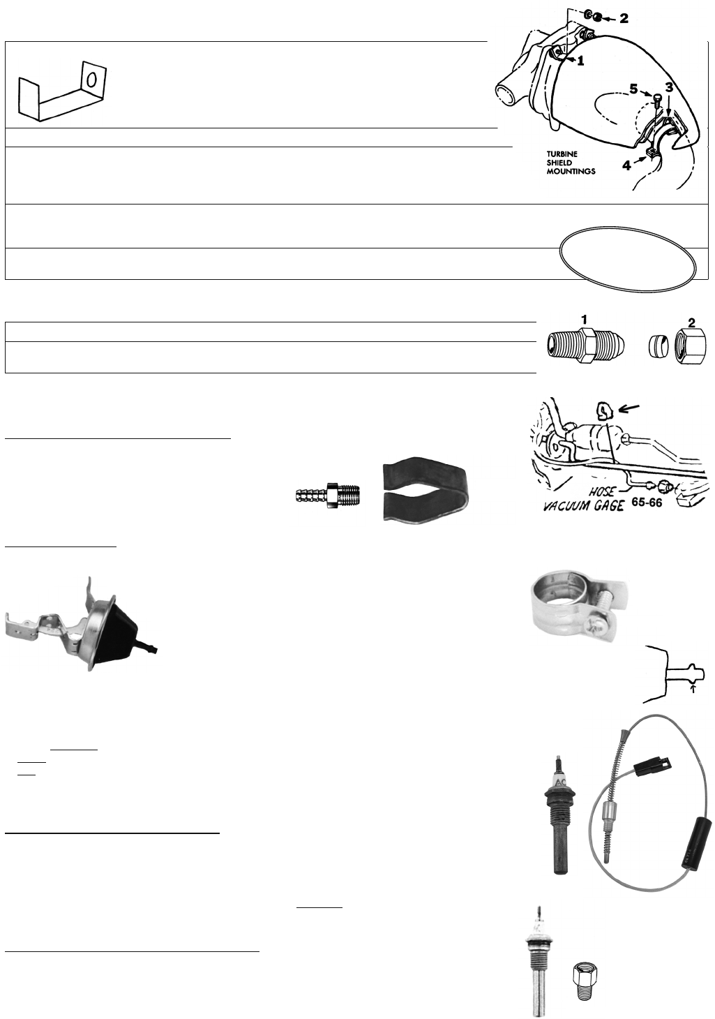 iWARNING: Products on this page can expose you to a chemical, which is known to the St ate of California to cause cancer or reproductive harm. **For more information go to www.P65Warnings.ca.gov**51Turbo Heat Shield ("Bullet Shield") - We can only supply a USED shield. See USED page 354PICTURE #1. Tabs - Turbo Shield: Yes! Those stainless tabs that always break off! Holds shield to Turbo body. Get these stainless tabs spot welded on and use that shield. 1962-66 Turbo. Check your length. 1962-63 (1 1/4") C5471E 1 oz. 1964-66 (1 1/2") C5471L 1 oz.2. Nut & Lock Washer: Set of 2 nuts & 2 lockwashers C7242 2 oz./set 3. Bracket - Turbo Shield: Bracket that welds to inside of shield and rests on the outlet exhaust pipe. Old one usually rusted or missing from bottom of shield. Suggest welding on (can install with sheet metal screws). 1962-64 C5679 2 oz. 1965-66 C5680 4 oz.4. Clamp -Turbo Shield: This is a strap-type clamp that clamps to the Turbo outlet pipe. The bracket underneath shield (item just above) slips into this clamp and that is what holds the shield to outlet pipe. Reproduction, ver y similar to the original. Includes attaching screw. 1962-66 C5681 4 oz.5. Screw - Clamp For reproduction clamp C7131 1 oz. For original clamp DiscontinuedH. Other Turbo Parts: Manifold Gauge PartsPICTURE #1. Brass Vacuum Gauge Fitting: Screws into inlet port on left head of 1962-66 Turbo. C1082 1 oz.2. Replacement Brass Ends: For vacuum gauge line. All 1962-66 Turbo & 140 HP. Used at engine and gauge end. Easily installs on plastic hose, just push on. C1083 1 oz.Manifold Pressure Hose: From manifold to dash gauge. These get brittle. Buy new connectors above. Includes instructions for using old connectors. 1962-66 Turbo & 140 HP C20 6 oz.Instructions Only for installing manifold pressure hose: Included with C20. C262 1 oz. Turbo Pressure Hose ClipThis clip was used to hold the pressure gauge hose to the chrome fuel line. Plain steel or chrome plated (not polished first). Not sure if used on early models. Plain C1198P 1 oz. Chrome C1198C 1 oz.Turbo Head Fitting: Right head, hose to distributor retard. Original Style C1150 3 oz. Pressure Retards: Turbos have a pressure retard on the distributor (looks like a vacuum advance). Also see "ADVANCE/RETARD" below. Be sure to check the one on your Turbo distributor to see that it's right. The number on the actuating arm should be (1962-64 #224 OR 231), (1965-66 #250). The small tube where the hose slides on should also have a raised "barb" to hold the hose on. This reproduction works well on all years. EX ACT REPROS #224 62-64 Turbos C13269 6 oz. #250 65-66 Turbos C13270 6 oz. Original Pressure Retard Hose Clamps: 2 Needed C2564C 2 oz.Turbo Advance & Retard: These work like a vacuum advance and advance the timing until the vacuum approaches "0" and goes into boost. At that time it works like an original retard unit and retards the timing. I have been starting with the timing at 18-20 degrees (vacuum "advance/retard") disconnected. Throttle response seems much quicker with and without boost. Boost seems to start sooner and go a little higher. 1962-66 C7877 6 oz. Original Pressure Retard Hose Clamps: 2 Needed C2564C 2 oz.Head Temp Sender Units: 1962-66 Turbo - ORIGINAL STYLE Orignal Thermister: Goes in left head and makes dash gauge work. Looks like a small spark plug. C436 Discontinued Gasket for original thermister C21 1 oz. Nut : Special for original thermister C1592 1/2 oz. "Idiot Light Sender": 1962-66 Turbo - Excellent Repro - Goes in right head. C437R 2 oz. Gasket for sender C644 1 oz.Thermister ReplacementThe "CHT-100" is an advanced Cylinder Head Temperature Sensor for the Corvair Spyder and Corsa models. Designed as a direct replacement for the obsolete AC Thermistor, the "CHT-100" uses thermocouple technology for reliable and accurate temperature measurement over the wide range of temperatures experienced in the Cor vair engine. It uses advanced digital technology to convert the thermocouple measurement to a constant resistance source, matched specifically to the Corvair dash mounted cylinder head temperature gauge. The result is a sensor that outperforms the original AC Delco design. Threads into original thermister hole - comes with instructions. Want more info? Visit web site vairtrix.com. No washer or nut needed. 1962-64 Spyder: C1717 4 oz. 1965-66 Corsa: C1718 4 oz.Thermister Adaptor for 80-110HP HeadsThese have been available for years but we would not sell them as they were very apt to break. These have been redesigned and are much stronger. If you have installed a Spyder or Corsa dash or are using the original head temp gauge, you can screw these adaptors into the spare "idiot light switch" hole & then screw in an original thermister.DO NOT OVER TIGHTEN! Just until snug. C10888 2 oz.ENGINE DISCOUNT !see Blue pg. MK-2TurboThermister ReplacementOriginal ThermisterC1150C1198PC1198CC2564CC10888