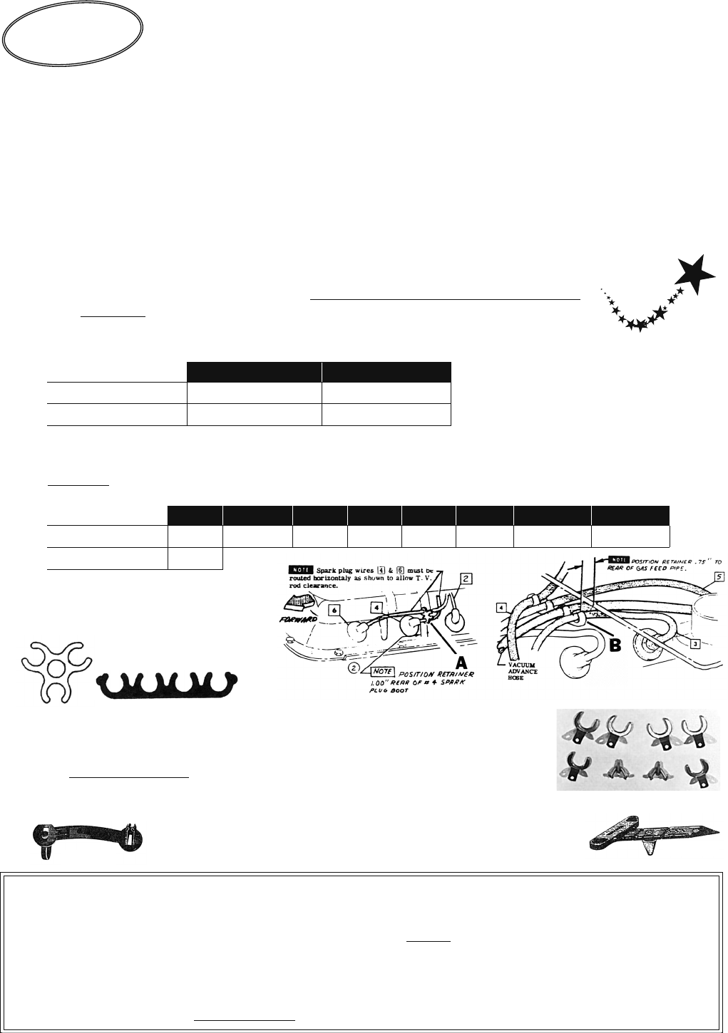 iWARNING: Products on this page can expose you to a chemical, which is known to the St ate of California to cause cancer or reproductive harm. **For more information go to www.P65Warnings.ca.gov**76Spark Plug CablesMULTI-KITSsee Blue pg. MK-5,6CABLES ARE SOLD SET OF 6 PLUG WIRES, COIL WIRE, & CORRECT STRAIGHT STYLE BOOTS INSTALLED (See Magwires for sets with straight & 90 degree boots)NOTES: A. Please read Page 75B before ordering. B. 1961-69 (exc. SMOG/AC) assumes you have the coil located next to the distributor. 1961-69 SMOG/AC assumes you have the coil mounted on the rear engine frame. 1 - Resistor: Carbon Core 1961-69 (exc. SMOG/AC) C58A 2 lbs. 1961-69 SMOG/AC C58AL 2 lbs.2 - Silicone Resistor: Black Wire 1961-69 (exc. SMOG/AC) C9527 2 lbs. 1961-69 SMOG/AC None3 - MAGWIRE: BEST ALL ROUND CHOICE - 7mm - All Straight Boots 7mm 1960 Only C3380M 2 lbs. 7mm 1961-69 (exc. SMOG/AC) C4636 2 lbs. 7mm 1961-69 SMOG/AC C4636L 2 lbs. 8mm 1961-69 (exc. SMOG/AC) C4636-8 2 lbs. Mag Coil Wires: Available separately 7mm 1961-69 (exc. SMOG/AC) C8111 6 oz. 7mm 1961-69 SMOG/AC C8112 6 oz. MAGWIRES: Straight & 90 Degree Boots See Bottom of page 75B for more info. Exc. Smog & AC With Smog or AC1961 (2 - 90 degree boots) C4812 2 lbs. SUB C4813L g1962-69 (3 - 90 degree boots) C4813 2 lbs. C4813L 2 lbs.4 - Deluxe Silicone Plug Wires You can order color samples for FREE Just ADD the color code to the end of SAMPW- (example SAMPW-A). Color code is in ( ) after the color. ON WEBSITE - Just click on SAMPW- and the various samples will display below. DO NOT ADD a color code to the end of the regular plug wire part number when ordering. By "Silicone Wire Systems". 2 lbs. /set Black Light Gray (J) Yellow (B) Blue (A) Red (D) Orange (E) Lime Green (F) Dark Purple (H)1961-69 (exc. SMOG/AC) C7861B C12633 C7861 C7860 C10782 C10891 C10892 C108941961-69 SMOG/AC C7861BL A - Spark Plug Wire Retainer - See Diagrams Left side: 1961-69. Plastic - Original. C7376 1 oz.B - Spark Plug Wire Retainer Right side: 1961-69. Plastic. Original. C7376R 2 oz.Plug Boot Hold Down Clamps: Keep those boots in at high speed. Requires drilling 6 small holes in the shroud. Sold set of 6. C5693 8 oz./setBlack Plastic "Tie Straps": Holds harness to body around engine. Original Style Engine Wiring Harness Straps Black C3143 1 oz. Pull Thru Harness Strap: Original for some years Black C755 1 oz.Why are Clark's Rebuilds the Best?We really do replace just about every part during a rebuild. We NEVER leave used bushings, contacts, bearings in your rebuild; they are all replaced with new parts. We are so proud of our rebuilt products, that we have an area on our website's home page so you can see the full parts list for our major rebuilds including generators, alternators, starters, carburetors, distributors, 65-69 rear wheel bearings, PG transmissions, & steering boxes.Go to www.corvair.com and click on "Rebuilds" on the home page.C7376C7376Rsketches from Assembly ManualC755C3143