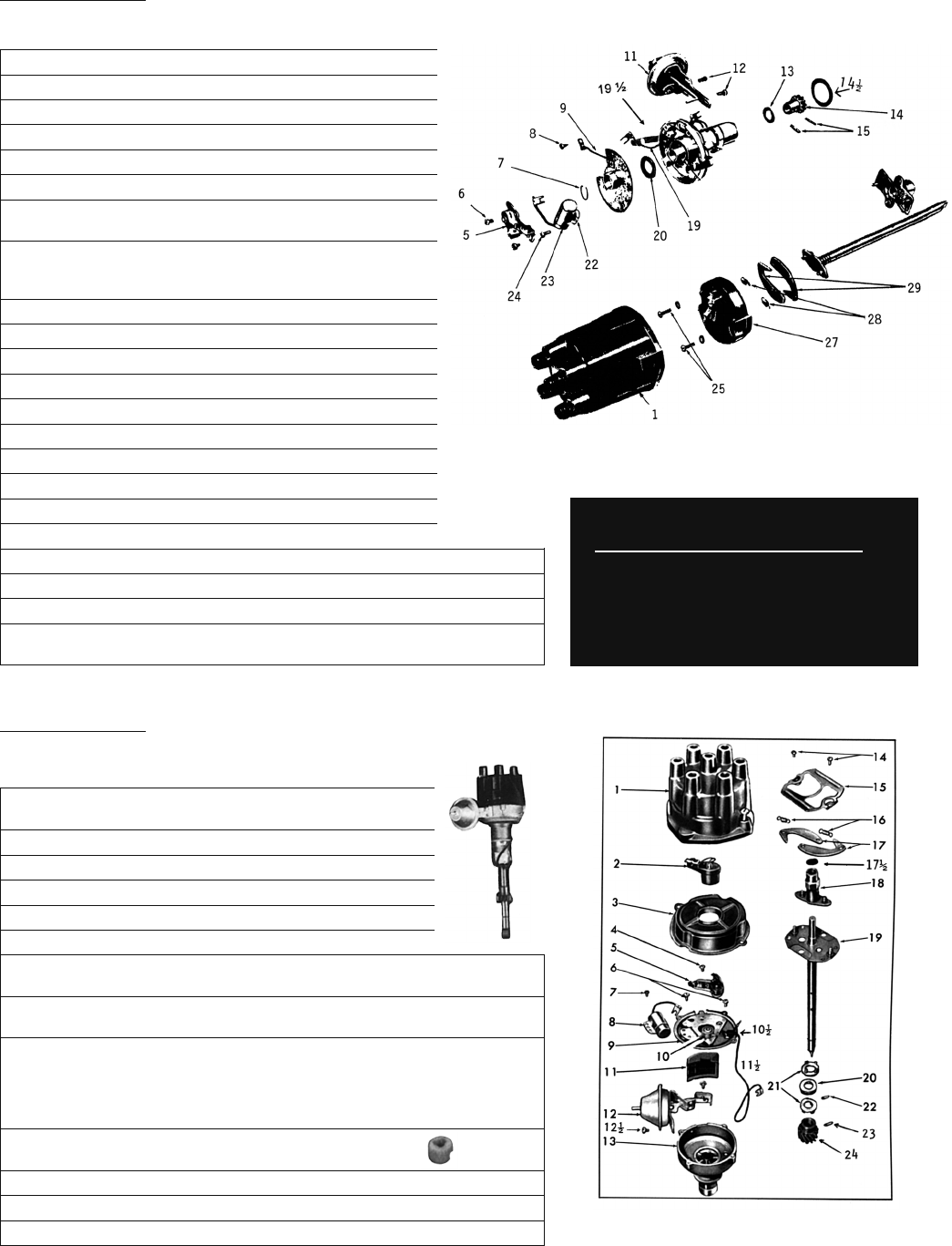 iWARNING: Products on this page can expose you to a chemical, which is known to the St ate of California to cause cancer or reproductive harm. **For more information go to www.P65Warnings.ca.gov**77'60-61 DistributorNEW Distributors: See "NOS" on website and REBUILT, pages 78 & 79.1960-61 Original Style Distributor Parts (Snap on distributor cap)1. Cap C988 8 oz. 5. Points C6688 4 oz. 6. Screws: Holds points in; Sold each. C1029 1/2 oz. 7. Spring : Washer, holds point plate. C3892 1 oz.8. Screw : Sold each. C4641 1 oz. 9. Lead: Breaker plate. C4642 2 oz.11. Vacuum Advance 60-61 with standard CX2093M 8 oz. 60-61 with PG CX2093P 8 oz.12. Screws - Vacuum Advance: Head may vary from the original. Sold set of 2. C4643 1 oz./set Oversize Screws: Sold set of 2. C4641X 1 oz./set13. Thrust Washer C4645 1 oz.14. Gear - Repro with pin C1366 6 oz. 14 1/2 . Gasket C589 1 oz. 15. Pins: Sold each. C1369 1 oz.19. Point Lead C530 2 oz.19 1/2 . Grommet: Where point lead goes thru. C11716 1 oz.20. Washer C9058 Discontinued22. Condensor Clamp C4640 2 oz.23. Condensor C987 2 oz.24. Condensor Clamp Screw C1843 1 oz. 25. Screws & Lock Washers: Sold set of 2 screws & 2 lock washers. C4644X 2 oz./set27. Rotor C867 4 oz.28. Weight Springs: Sold each; 2 needed. 1960 PG C4647 Discontinued29. Weights: Sold each. 2 needed. 1960-61 Standard C1819 2 oz. 1961 High Performance C1820 2 oz.PICTURE # -- Items NOT numbered are discontinued.'62-69 DistributorNEW Distributors: See "NOS" on website and REBUILT, pages 78 & 79.1962-69 Distributor Parts - Cars & Vans (FC)?1. Distributor Cap G M C985 6 oz. Non -GM C57 6 oz.?2. Rotor GM C983 2 oz.3. "Dust" Cover 1962-68 C984 4 oz. 4. Point Screw: Hold down - the one you always lose. C1029 1/2 oz.5. Points GM C982 4 oz.6. Screws: Holds point plate; Sold set of 2. C4637 1 oz./set7. Condensor Clamp Screw C1843 1 oz. Oversize for Stripped Screw C3894 1 oz.?8. Condensor: Clamp included. GM C987 2 oz. No n-GM C55 2 oz.?9. Point Plate: Wears and allows dwell variance. 1962-69. Seldom have. C1166 8 oz. High Performance Point Plate: This is a REBUILT stock point plate with a brass pivot bushing added (for easier, smoother movement) and a special ground wire. 1962-69 C7825 8 oz. Price includes a refundable core fee.?10. Wick: Sponge that keeps cam lubricated. C531 2 oz. S pring: By wick. CX4124 1 oz. 10 1/2 . Grommet : Where point lead goes thru. C529 1 oz. 11. "Boot" - Vacuum Arm: 1962-69. C103 2 oz.11 1/2 . Lead - Point: Wire is often frayed. C530 2 oz.PICTURE # ?Most Often Needed Parts*More Parts Page 7895% OF THE ANSWERSThe SHOP MANUALS & ASSEMBLY MANUALS can answer 95% of all technical questions we get. Absolutely your best investment. They answer questions that you'd never even think to ask!