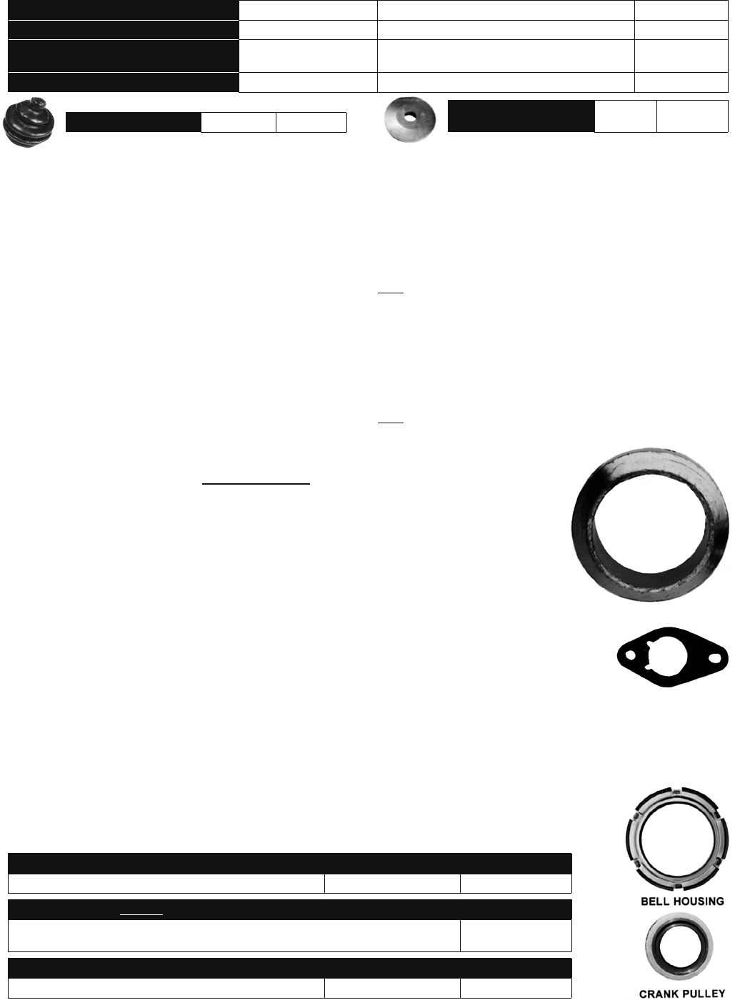 iWARNING: Products on this page can expose you to a chemical, which is known to the St ate of California to cause cancer or reproductive harm. **For more information go to www.P65Warnings.ca.gov**COPPER CYLINDER BASE GASKETSThese gaskets will slightly lower the compression ratio. They are die cut from copper sheets .020" thick (.005" thicker than stock). They are the same thickness that GM used on air-conditioned engines. Each .010" thickness increase ADDS 1.5 cc's to the head chamber volume. This equates to an approximate .225:1 compression ratio decrease in a late engine when used in conjunction with our stackable copper head gaskets. We DO NOT recommend the stacking of base gaskets: however, with one copper cylinder base gasket and the proper choice of our head gaskets you can reduce compression to the desired ratio. Note: Actual thickness may vary + or - .002" from listed thickness. GRAPHITE EXHAUST PACKINGSALL CLARK EXHAUST PACKINGS - individually or in KITS, ARE GRAPHITE! These packings are produced to CLARK specifications and are the BEST packings that have ever been available. GRAPHITE PACKINGS are BETTER because: ? NO bad odor the first 4-5 times you start your engine. ? STRONGER! Steel reinforced graphite is much less apt to crumble or break apart.? GRAPHITE is much less affected by heat, moisture, oil? GRAPHITE packings can be made to more exact dimensions and compress for a tight, leak-proof fit. ? SAFER - less apt to leak. ? NO ASBESTOS or other "MYSTERY" material. "PLASTIC" CARB. SPACERS - These were discontinued by GM. We had the material analyzed by a lab with the instructions to give us a BETTER "modern" material without the asbestos. The new material can take MORE heat than the originals and still has good hot and cold flexibility and strength. We now have dies that produce parts so flat that the spacers do not have to be resurfaced (like the originals had to be). It is still suggested you use a thin gasket above and below the "plastic" spacer. CLARK EXCLUSIVE - SEE PAGE 56 Clark's CRANK SEALS - the BEST QUALITY POLYACRYLATE & VITON See page 3 for correct seal installation. Unlike some seals on the market that are made from nitrile, our regular seals are polyacrylate (as specified by major USA seal manu-facturers). It is more expensive, has a higher temperature rating and better oil resistance. Now we also have bell housing and crank pulley seals that are exactly the same as the original seals but produced with brown Dupont VITON. You can order any of our GASKET OR SEAL KITS with VITON crank seals by just ADDING V to the end of the part number.Crankshaft Seals: 1960-69 ALLBELL HOUSING Original - Polyacrylate VITONFits in bell housing (be sure to order bell housing gasket C4628) C493 6 oz. C493V 6 oz.CRANKSHAFT SEAL SPACERNeeded when a 1964-69 crankshaft is used in a 1960-63 engine. Helps position seal into correct loca-tion on crankshaf t gear. Also use to position seal on new area of any crankshaft gear.C5311 2 oz.CRANK PULLEY - REAR HOUSING SEAL Original - Polyacrylate VITONCommon oil leak area C483 4 oz. C483V 4 oz. 7AOil Dipstick Hole Grommet style1965-69 C96R 2 oz.A solid copper head gasket is far superior to the stock folded steel type gasket. The thin metal edge of stock gaskets can result in hot spots that cause detonation and burn through. The not uniform thickness of steel gaskets will deform the gasket surface of your aluminum heads. With solid copper you have a uniform pressure between the cylinder and head that provides a reliable seal without hot spots. Our copper gaskets are good for stock through +.060 overbore. Due to lower octane levels in the fuel available today, some pinging in the hi-performance and turbo-charged engines is being experienced. In order to simplify a minor reduction in compression, we offer gaskets .010" thicker than stock (.042") and .020" thicker (.052").These head gaskets are also ideal to compensate for cylinder head resurfacing when no compression increase is desired. In many cases, .030" or more is required for a good cleanup. Due to the solid copper design you can "stack" these gaskets two high and mix or match the two thicknesses to acquire the head volume desired. This practice is also helpful when putting a turbo on hi-performance heads. Many people overlook the fact that increased bore sizes also increase compression. These copper gaskets are made from the correct grade of copper. Note: Actual thickness may vary + or - .002" from listed thickness. INDIVIDUAL GASKETS & SEALSCrankcase Tube thru Bottom Shroud1961-62 Grommet - not exact but works good. C10046 4 oz.Right Rear Shroud below Distributor1960-69 Heat switch wire goes thru it. Exact Repro. C1278R 1 oz.Left Front Shroud where Wire Goes to ThermisterAll 1962-66 Spyder & CorsaHead temp sender unit. Usually brick hard if old. Exact Repro.C1278R 1 oz.Right Shroud Where Smog Pump Tube goes thru1968-69 Next to distributor. DiscontinuedOil Dipstick Hole Boot1960-64 All C95 2 oz. COPPER HEAD GASKETS