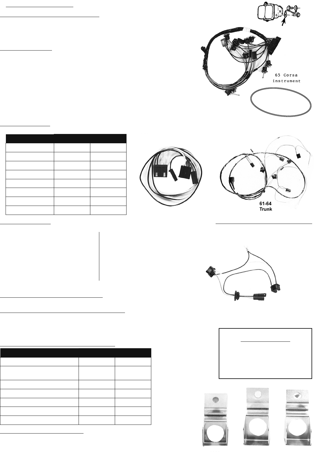 iWARNING: Products on this page can expose you to a chemical, which is known to the St ate of California to cause cancer or reproductive harm. **For more information go to www.P65Warnings.ca.gov**98A Voltage Regulator Ground Wire: Fits all 1965-69 - essential due to rubber regulator mount. C9657 2 oz.INSTRUMENT HARNESS - 1965-69: This is the complete harness with connectors, light sockets and gauge connectors that go to the "dash". All 1 lb. ea. 1965 All (exc. Corsa) C9117 1966 Corsa C9120 1965 Corsa C9118 1967-69 All C9121 1966 All (exc. Corsa) C9119HEATER HARNESSHot Alr Heater: Attaches to heater control unit to resistor in defroster outlet & to dash harness (not part of dash harness). Note: FC heater resistor in defroster duct. 1961 All Cars C12108 1 lb. 1962-64 All Cars C12109 1 lb. 1961-63 FC C12110 1 lb. 1964-65 FC C12111 1 lb. 1961-62 Heater Control Lamp Wire C12085 6 oz.Gas Heater Harness - 1960 Main Harness from Control 1960 Cars C12112 1 lb. Junction Block on Heater to Main Harness 1960 Cars C12113 1 lb. Burner to Overheat Switch 1960 Cars C12114 1 lb.WIPER HARNESS: Plugs into harness & goes to wiper. Complete & original. (1967-69 is part of dash harness)Rubber Grommet: 1960-64 Cars, wiper harness C6869 2 oz.Year & Model Single Speed 2-Speed1960 Cars C12090 - - - - - - - -1961 Cars C12090 C120911961 FC C12092 C120931962 Cars C12094 C120951963 Cars C12094 C91131964 Cars C12094 C91131965 Cars (striped wires) C12096 C120971966 Cars C12098 C9114TRUNK HARNESS: All wires from trunk connector to horns, lights, etc. Includes all connectors and rubber grommets attached. Also includes horn wire clips. All 2 lbs. ea.1960 500 ("T" cross section) C12080 1965 500 C91101960 500 (round cross section) C12544 1965 Monza & Corsa C8374E1960 700 ("T" cross section) C9106 1966 500 C91101960 700 (round cross section) C12545 1966 Monza & Corsa C8374L1961-63 500 Cars & Wagon C9107 1967 500 C120831961-63 700, Monza, Spyder C9108 1967 Monza Only C83871964 500 C12081 1968-69 500 C91111964 700, Monza, Spyder C8373 1968-69 Monza C8388 1960-61 Horn Wire Only (with dual horns) C12088 8 oz.1961-64 CAR HEADLIGHT HARNESS: Attaches to trunk harness & to the headlight bulbs. Sold as a full set only (for both sides). C10804 12 oz.FC HEADLIGHT & PARKING LIGHT HARNESS: Both harnesses are sold as a pair. The ground wire was originally swedged to headlight body - new one uses a screw. NOTE: Parking light socket will be different from the original metal one. It will require some cutting and caulking or epoxy but good replacement for old rusted ones. Instructions included. 1961-65 Headlight Harness - Pair C9257H 2 lbs. 1961-65 Parking/Directional Harness - Pair C9257P 1 lb.CAR UNDER DASH COURTESY HARNESS: From jamb switch (with bulb sockets). All 10 oz. ea.Year & Model Cars (exc. CT) Convertible1960-61 C12051 - - - - - - - -1960-62 E xtension Harness - 700 ONLY From door jamb switch to courtesy harnessC12057 - - - - - - - -1962 C12052 C91231963 C12053 C91231964 C12054 C91241965-66 C12055 C120561967-69 C9125 C12056COURTESY LIGHT SUPPORTS: Plated; May be slightly different from originals. Sold each. 1960-64 Coupe, 4 Door & Wagon C2550C 2 oz. 1962-64 Convertible C2550E 2 oz. 1965-69 All C2550 2 oz.HARNESS DISCOUNTsee Blue pg. MK-7Battery Cables - See page 81All 1 lb. eachTRUNK LIGHT (ACCESSORY) WIREFuse block to light. 4 oz. ea. 1965-66 C12089 1967-69 C12106C10804GLOVE BOX WIREFrom fuse with end connectors only. For 500s & Cars that did not have from the factory.1960-61 C12084 8 oz.1962-64 C9116 8 oz.C9657C2550CC2550E C2550