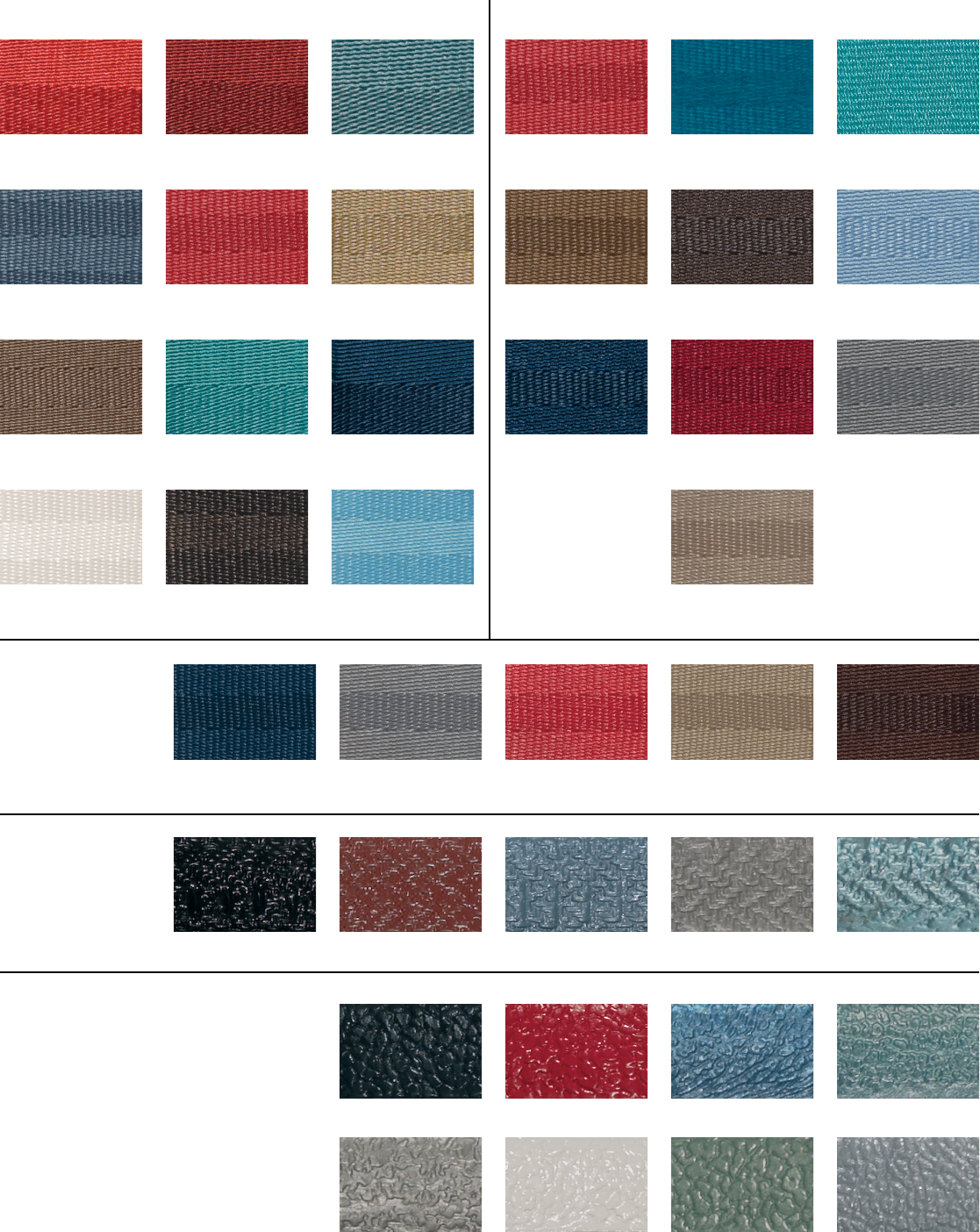 G NOTICE! All codes are below the samples, Printed colors and colors on monitors may not equal the actual color. If critical, please request an actual sample. NO RETURNS DUE TO COLOR. SAMSB-F med blue/grayish SAMSB-MR med red SAMSB-N gold tan SAMSB-15 med saddle SAMSB-16 med dk brown SAMSB-43 powder blue lt SAMSB-A bright red SAMSB-B dark red SAMSB-E silver pdr blue SAMSB-12 bright red SAMSB-13 turq/med bt blue SAMSB-14 med turq SAMSB-V dark saddle SAMSB-Y med turq SAMSB-GG navy blue SAMSB-44 very dark blue SAMSB-45 med red SAMSB-83 gold/fawn SAMSB-46 light silver SAMSB-LL ivory SAMSB-MM med dk brown SAMSB-PB blue pdr blue SAMSB-J dark blue SAMSB-Q gray SAMSB-R red SAMSB-T fawn SAMSB-X bronze C6929A - black C6930A - red C3931A - blue C6932A - fawn C7348 - aqua C1309A - black C7284A - fawn C3589A - red C7285A - off-white C3590A - blue C7286A - green C7283A - aqua C7287A - gray Other $$ Saver Seat Belts - pg 169 Windlace Samples - Repro - pg 271C Windlace Samples - non-original - pg 271C Seat belts - pg 169 $$ Saver Seat Belts - pg 169