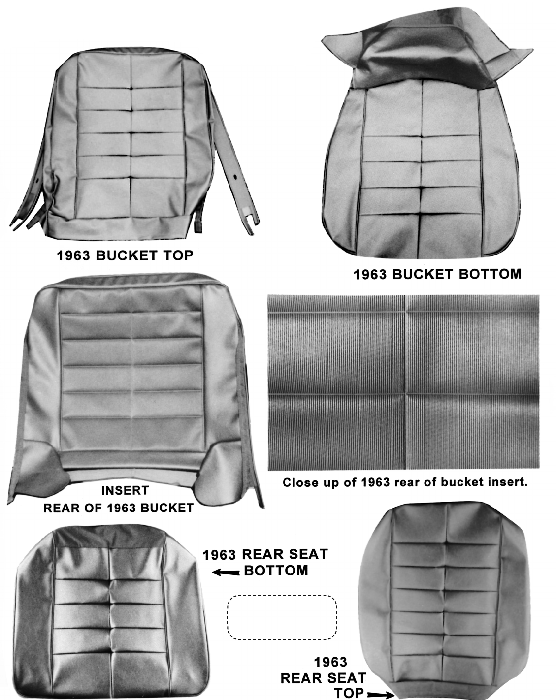 iWARNING: Product s on this page can expose you to a chemical, which is known to the State of California to cause cancer or reproductive harm. **For more information go to w ww.P65Warnings.ca.gov**3 1963 UPHOLSTERYThese are actual photos of our upholstery - not installed.12-14 hoursto produce!COLOR SAMPLES page 181963 BUCKET TOP INSERT 1963 BUCKET BOTTOM Close up of 1963 rear of bucket insert. 1963 REAR SEAT ._BOTTOM ~------------------~ , ' I \ I I I I I I I I I I \ I '~------------------~' 1963 REAR SEA TOP
