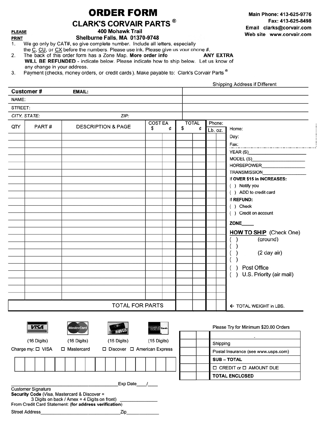 35NO COD SERVICESDuty and taxes are extraBrokerage fees included FedExFedEx ExpressSaver (3 day)FedExFedEx Priority Overnighton pgs 31-34.Sales Tax in required statesI ORDER FORM CLARK'S CORVAIR PARTS (R) PLEASE 400 Mohawk Trail PRINT Shelburne Falls, MA 01370-9748 1. We go only by CAT#, so give complete number. Include all letters, especially Main Phone: 413-625-9776 Fax: 413-625-8498 Email clarks@corvair.com Web site www.corvair.com the .Q., CU, or CX before the numbers. Please use ink. Please give us vour ohone #. 2. The back of this order form has a Zone Map. More order info ANY EXTRA WILL BE REFUNDED -indicate below. Please indicate how to ship below. Let us know of any change in your address. 3. Payment (checks, money orders, or credit cards). Make payable to: Clark's Corvair Parts (R) Customer # EMAIL: NAME: STREET: CITY, STATE: ZIP: QlY PART# DESCRIPTION & PAGE COST EA $ ? TO TA L FOR PARTS I VISA" I -IE] (16 Digits) (16 Digits) (16 Digits) (15 Digits) Charge my: ? VISA ? Mastercard ? Discover ? American Express I I I I I I I I I I I I I I I I I ________________ Exp Date __ / __ Customer Signature Security Code (Visa, Mastercard & Discover = 3 Digits on back/ Amex = 4 Digits on front} From Credit Card Statement: (for address verification) Street Address ____________ Zip ____ _ IDPlnQ ress 1 1 eren Sh" . Add "f D"ff TOTAL Phone: $ ? Lb. oz. Home: Day: Fax: ?-??-??-??-??-??-??-??-??-??-??-??-?? YEAR(S) MODEL(S) HORSEPOWER TRANSMISSION If OVER $15 in INCREASES: ( ) Notify you ( ) ADD to credit card If REFUND: ( ) Check ( ) Credit on account ZONE __ HOW TO SHIP (Check One) ( ) (ground) ( ) ( ) (2 day air) ( ) ( ) Post Office ( ) U.S. Priority (air mail) ~ TOTAL WEIGHT in LBS. Please Try for Minimum $20.00 Orders Shipping Postal Insurance (see www.usps.com) SUB - TOTAL ? CREDIT or ? AMOUNT DUE TOTAL ENCLOSED
