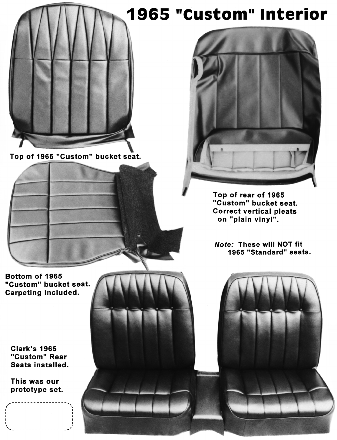 iWARNING: Product s on this page can expose you to a chemical, which is known to the State of California to cause cancer or reproductive harm. **For more information go to w ww.P65Warnings.ca.gov**6COLOR SAMPLES page 1916-18 hoursto produce!MOST COMPLEX OF ANY SEATS WE MAKE! The pleats alone take over 9 hours.1965 "Custom" Interior Top of 1965 "Custom" bucket seat. Bottom of 1965 "Custom" bucket seat. Carpeting included. Clark's 1965 "Custom" Rear Seats installed. This was our prototype set. -------------------, , ' I \ I I I I I I I I I I \ I ' , , __________________ , Top of rear of 1965 "Custom" bucket seat. Correct vertical pleats on "plain vinyl". Note: These will NOT fit 1965 "Standard" seats.