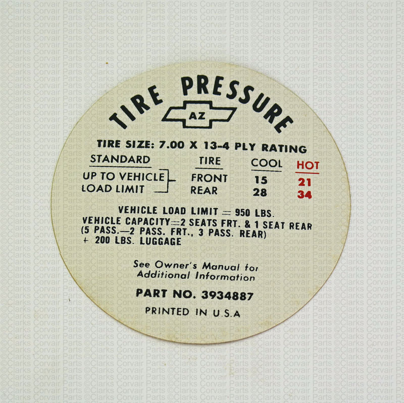 Part number C3232: 68 & 69 TIRE PRESSURE DECAL