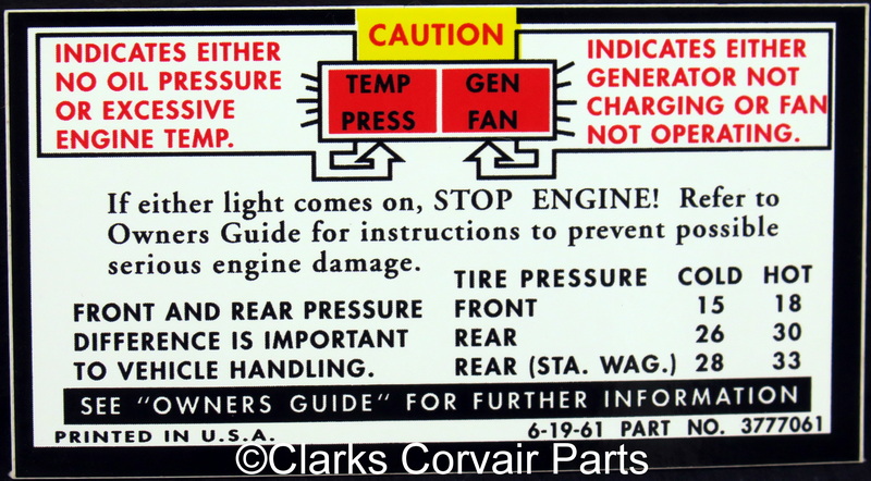 Part number C414: 60-64 CAR TIRE PRESSURE & ENG WARNING DECAL*!*!NOT EXACT FOR 1960-(VANS DID NOT USE
