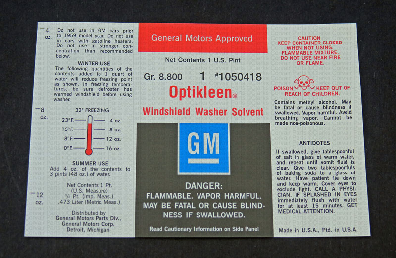 Part number C4303L: 1968-69 GLASS WASHER BOTTLE LABEL GM # 1050418 WET & STICK BACKING
