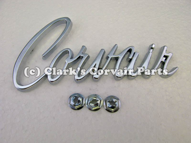 Part number CX2200 (NOS): FRONT EMBLEM-66-69 "CORVAIR" SCRIPT-BY LEFT HEADLIGHT(3 STUD);SET/4 NUTS=C6179N(NOT