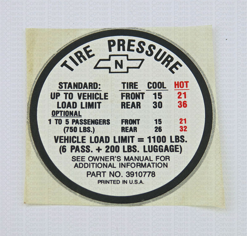 Part number C9747: DECAL-1967 CP & 4-DR TIRE PRESSURE CT HAS "S" ON IT. ABOVE DECAL HAS "N"
