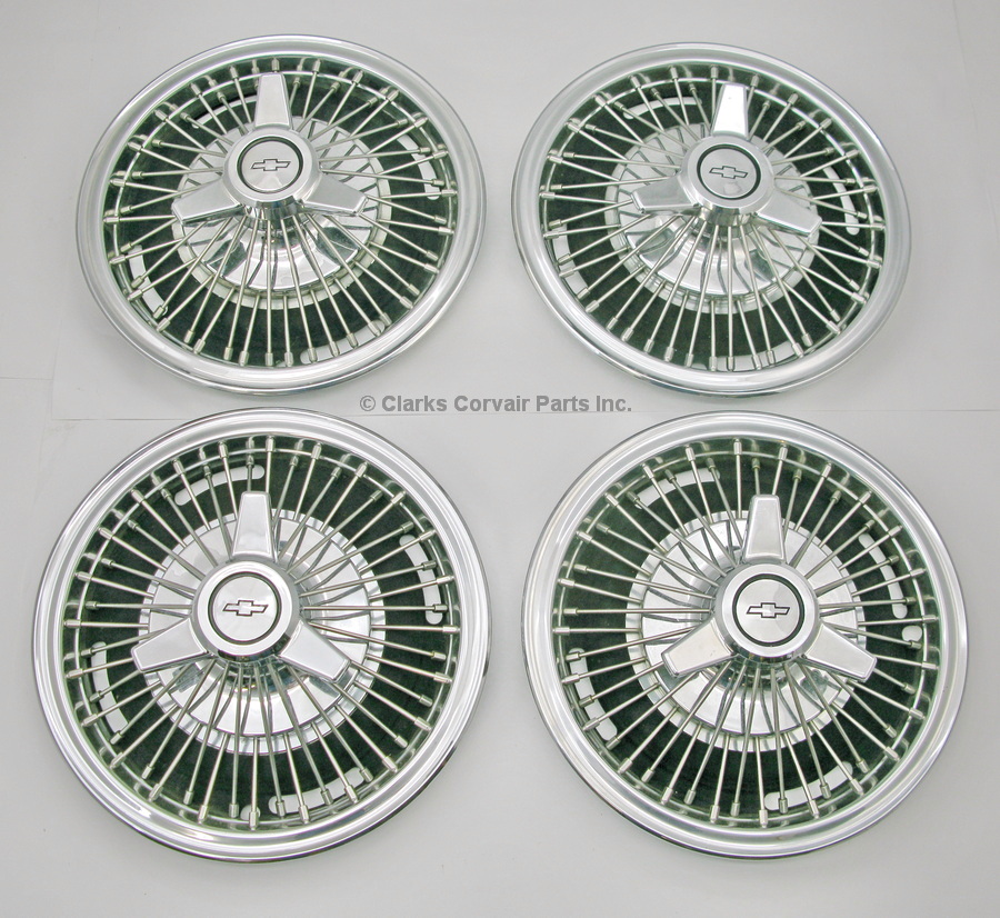 Part number CX9382: NOS WIRE WHEEL COVERS W/3 PRONG SPINNERS SET/4. INSTALLED, BUT NEVER DRIVEN.