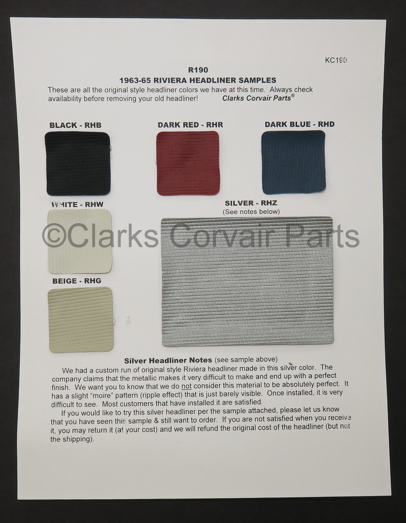 Part number R190: CHART OF ALL RIVIERA ORIGINAL GRAIN HEAD LINER SAMPLES WE HAVE